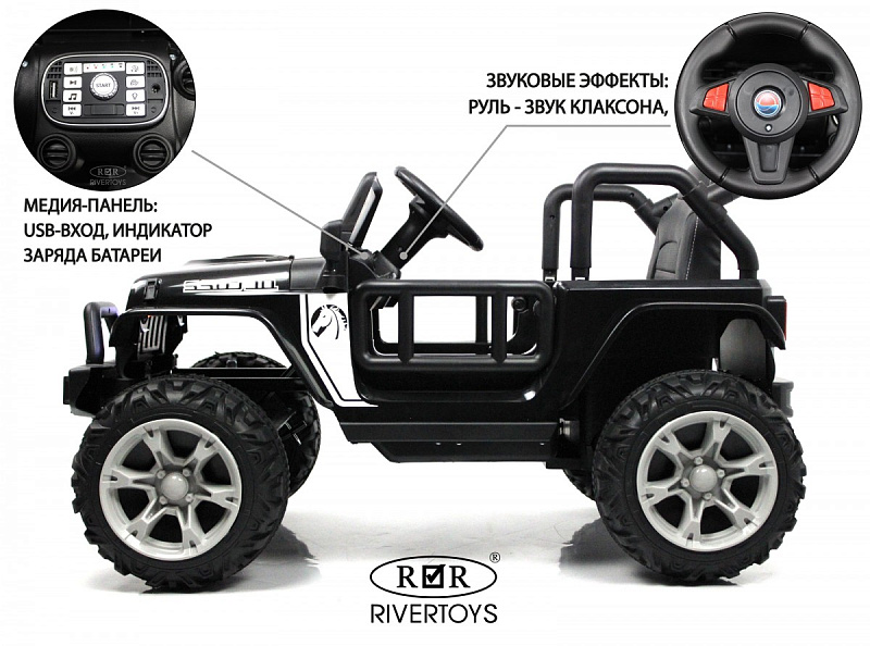 Модель джипа с коробкой автомат – идеальный подарок для детей. Ведь езда на этой модели действительно будет захватывающей, а главное, удобной! За комфорт маленького водителя отвечают: удобное кожаное сиденье, ремень безопасности и каучуковые колёса с амортизаторами. Маленькие почемучки придут в восторг от возможности подключить любое электронное устройство прямо в слот на приборной панели.