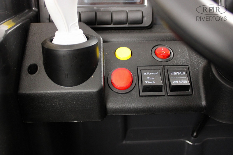 Медиа-панель электромобиля оснащена USB-входом и FM-радио, что позволяет слушать музыку и радио во время поездки. Ковш-короб управляется с помощью рычага, который позволяет перемещать ковш вверх и вниз.