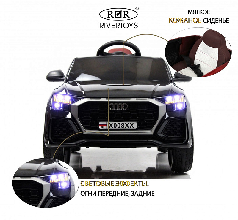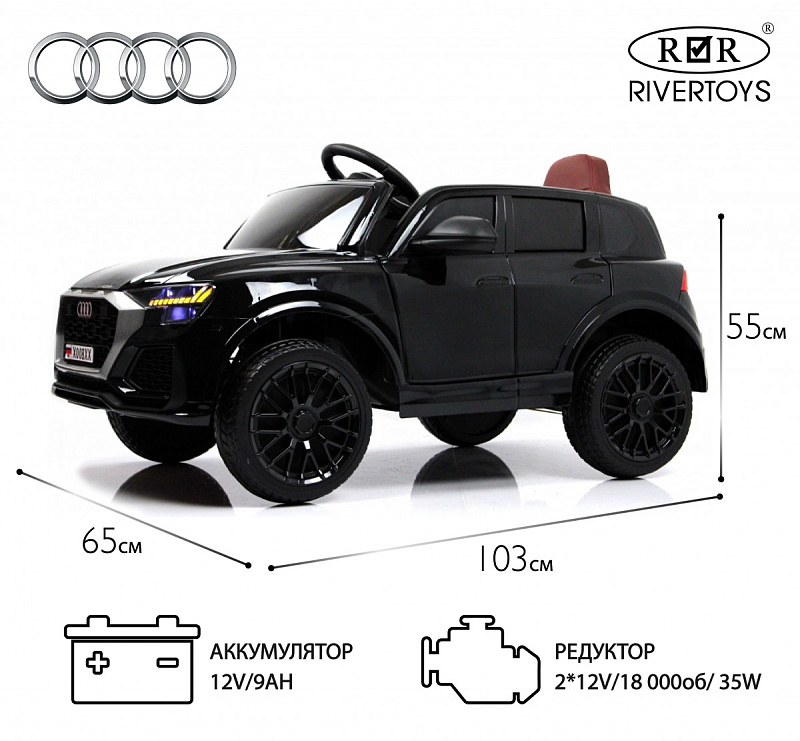 Этот электромобиль выполнен в виде уменьшенной копии джипа Audi и предназначен для одного ребенка. Он имеет два режима скорости - высокую и низкую, с максимальным разгоном до 3-6 км/ч вперед и назад.