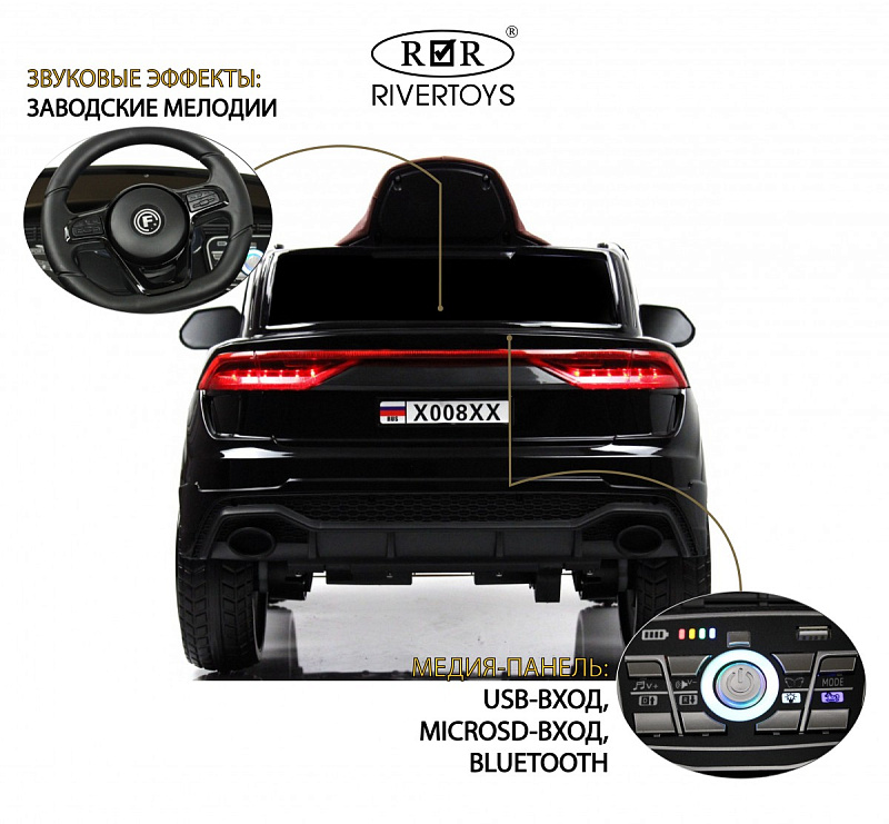 Сиденье выполнено из эко-кожей и дополнено полостным ремнем безопасности, обеспечивающим безопасность и комфорт во время поездки. Передние и задние фары создают яркое освещение и делают поездку более увлекательной. Музыкальный руль воспроизводит звук клаксона и заводские мелодии, придавая поездке атмосферу настоящего вождения.