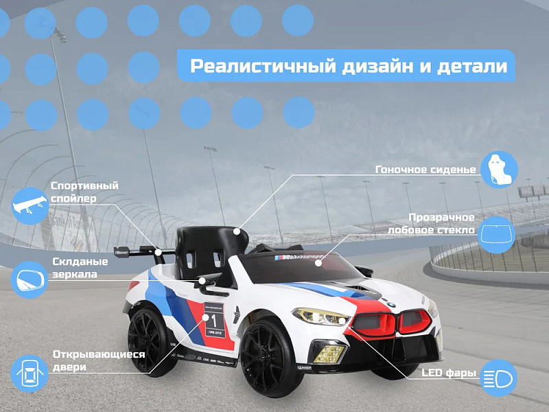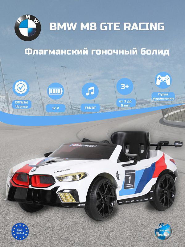 BMW M8 GTE 12V - идеальный электромобиль для маленьких любителей гонок в возрасте от трех лет и старше! Благодаря специальным наклейкам и спойлерам, а также аутентичному дизайну дети переносятся в мир автоспорта. Электромобиль развивает скорость до 5 км/ч, а встроенный разъем AUX и радио делают вождение еще более увлекательным. Оригинальный BMW M8 GTE участвует в чемпионате мира FIA по гонкам на выносливость, который включает в себя легендарные 24 часа Ле-Мана.