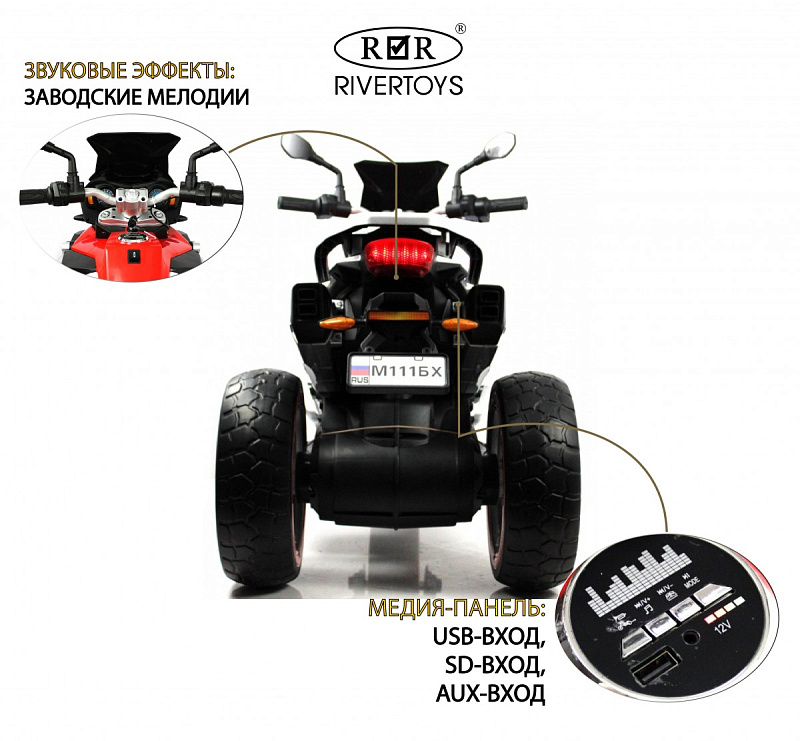 Детский электромотоцикл RiverToys М111БХ предназначен для одного ребенка. Модель оснащена передними и задними фарами со световыми эффектами, что делает поездки в темное время суток более безопасными и зрелищными.