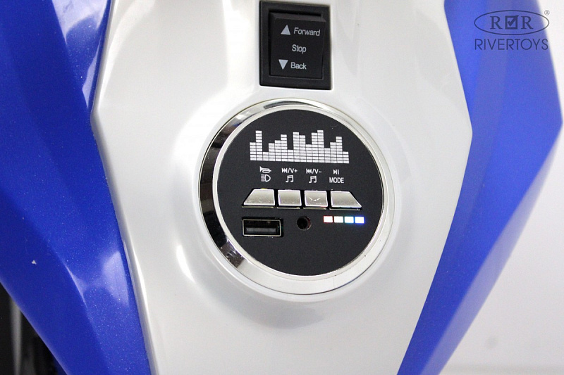 В этой модели есть подсветка передних и задних фар с режимом аварийной сигнализации, а также звук клаксона и стандартные мелодии. Медиа-панель поддерживает подключение внешних устройств по USB, AUX или Bluetooth для прослушивания любимых песен.