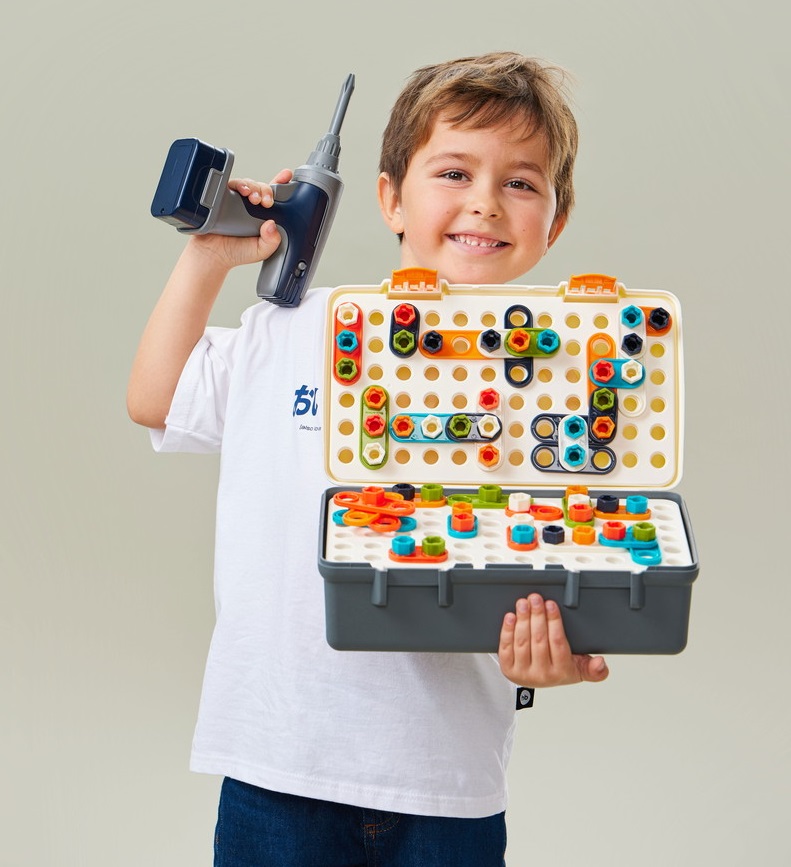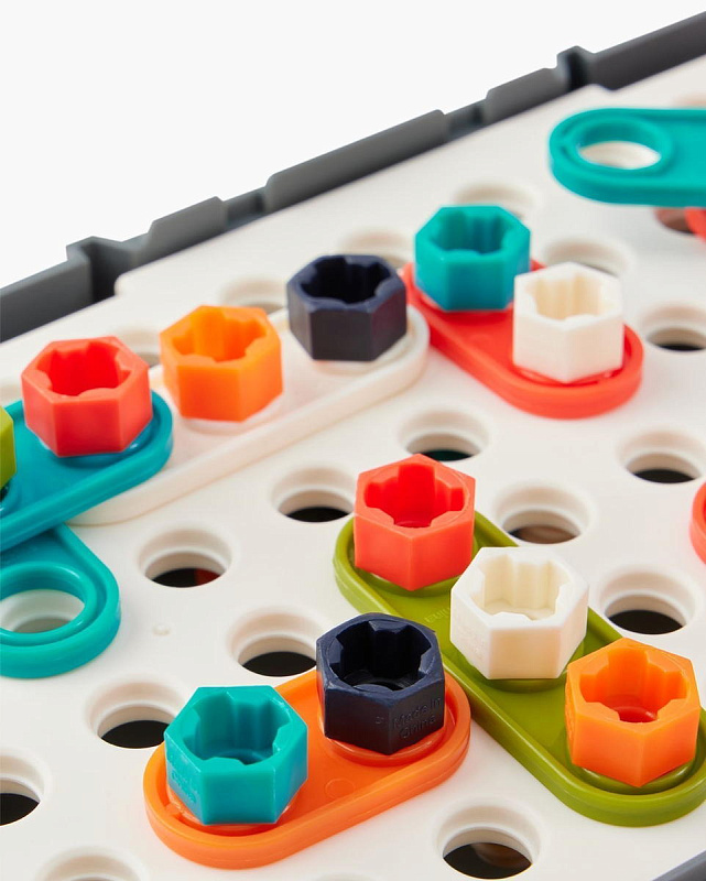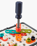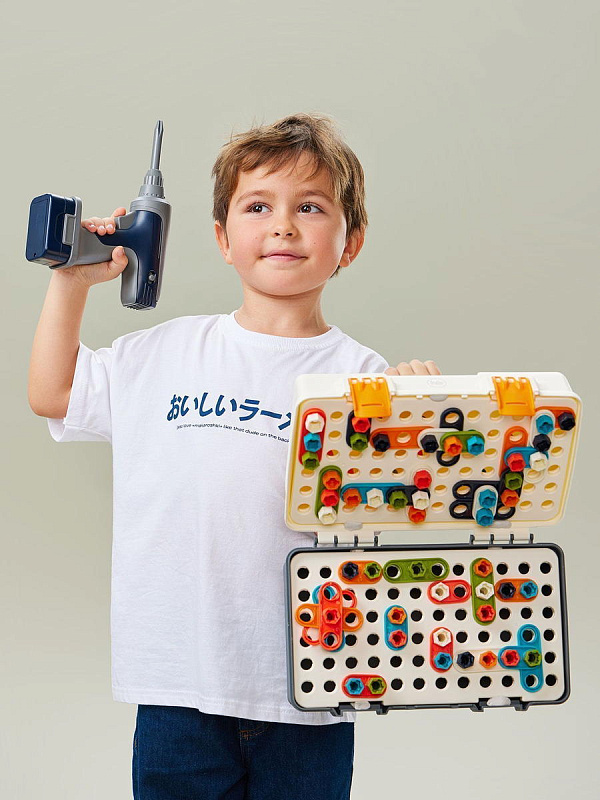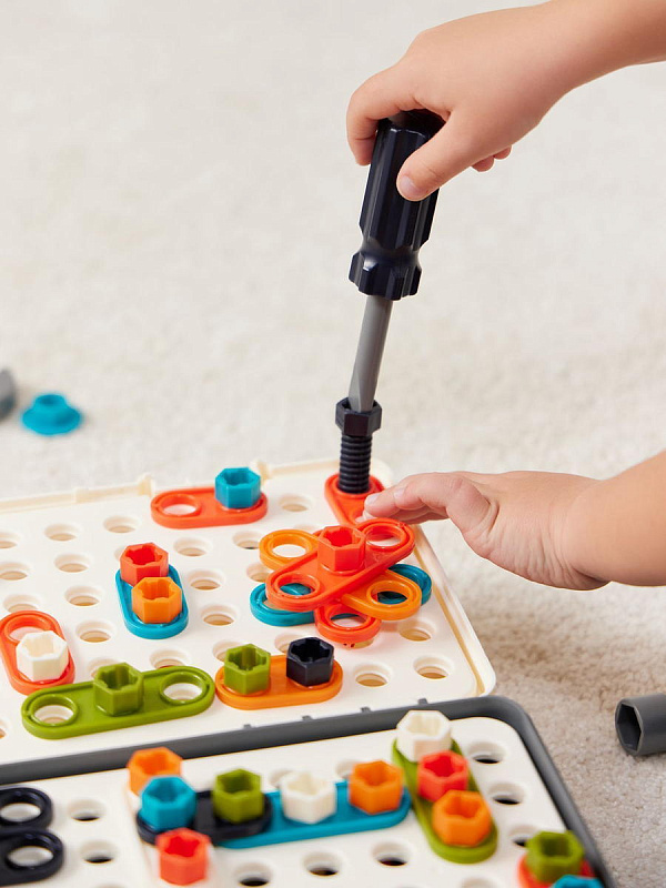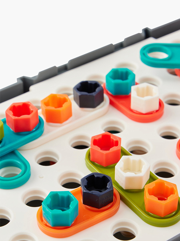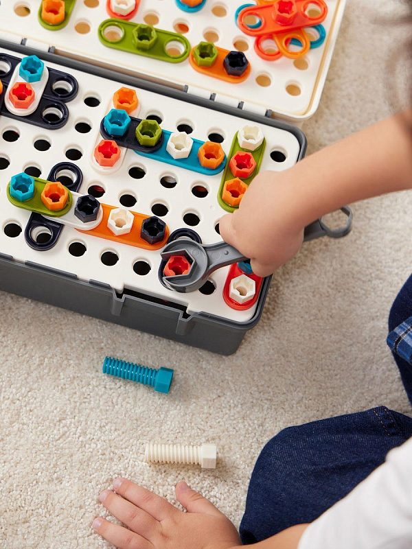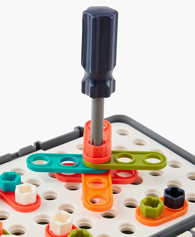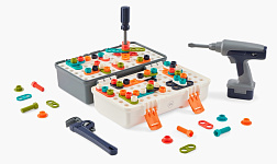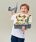 Конструктор с набором инструментов упакован в удобный ящик, который выглядит, как настоящий. Основание в сочетании с яркими деталями позволяет часами создавать интересные мозаики и сочетания. Всем, кто грезит папиной отверткой и плоскогубцами, рекомендовано. Игрушка развивает мелкую моторику, логику и воображение. Благодаря удобной упаковке все детали будут на своем месте и не потеряются после игры.