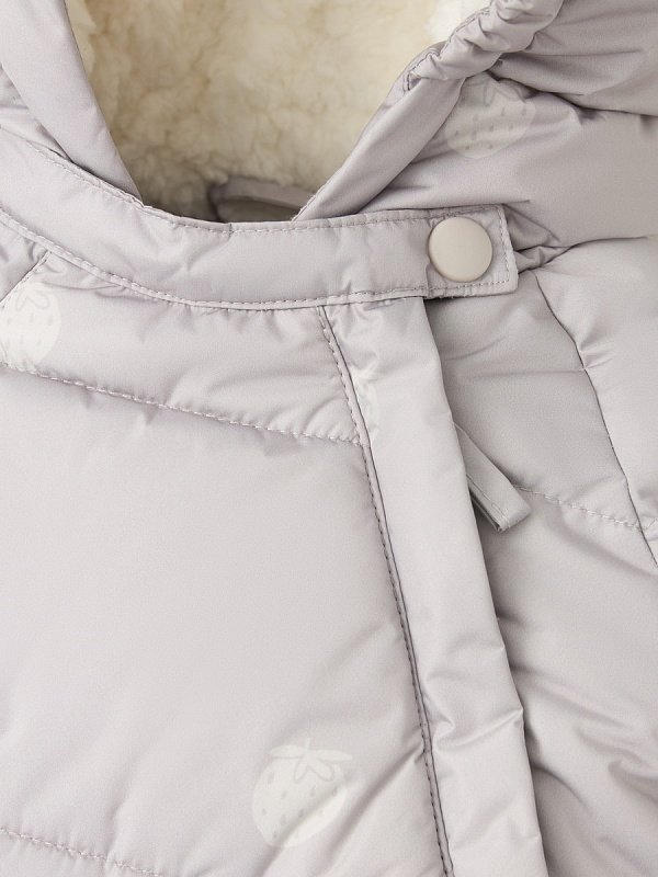 Несъемный капюшон защищает малыша от сильного ветра на прогулке, а подкладка из мягкого флиса с ворсом обеспечивает тепло и комфорт. Подкладка комбинезона выполнена из мягкого гипоаллергенного 100% хлопка.