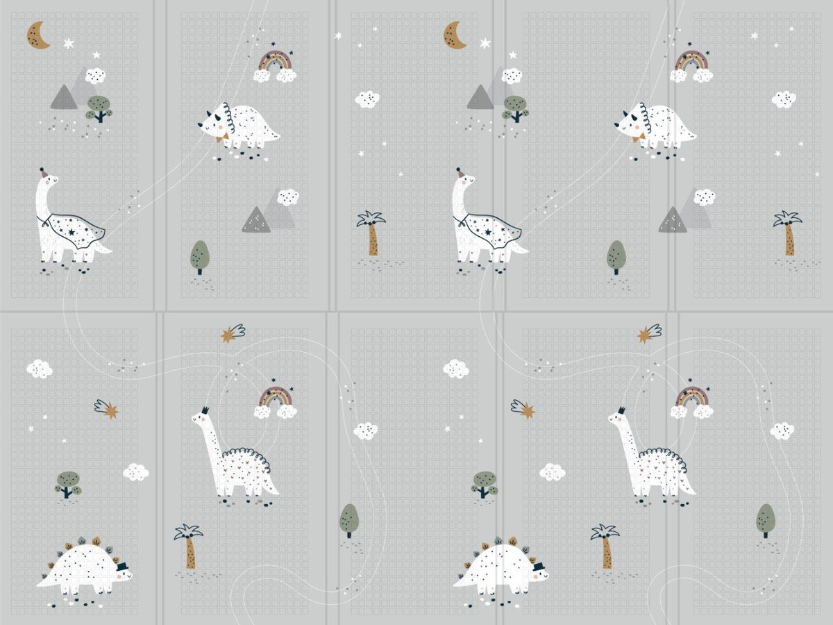 Стильная сканди-расцветка коврика с динозаврами сделает детскую уютной и красивой, а вторую сторону спокойной расцветки без принта оценят последователи системы Монтессори.