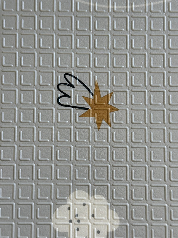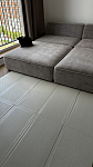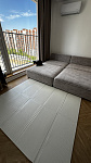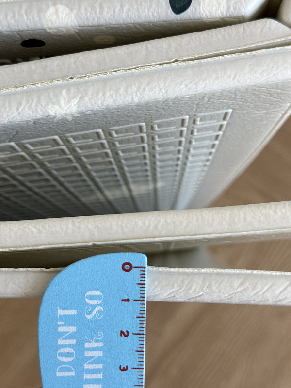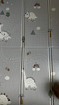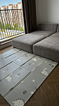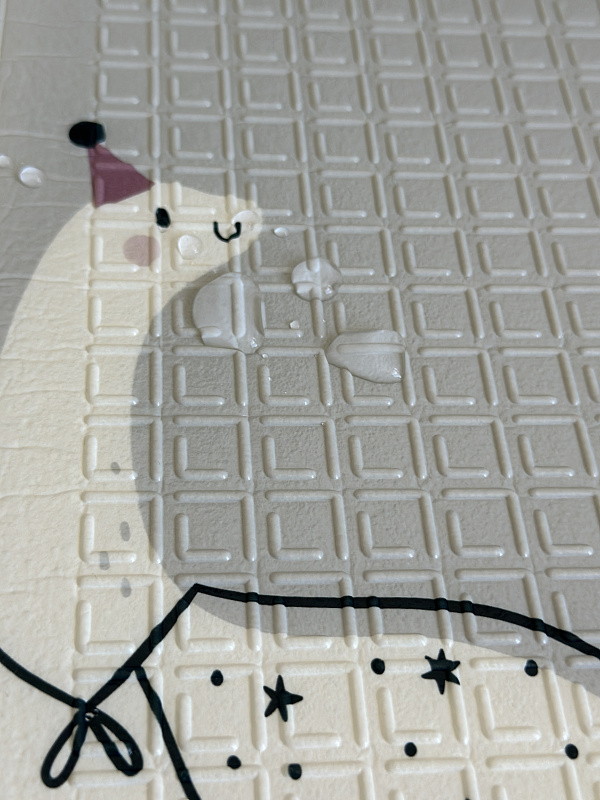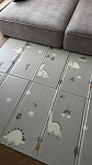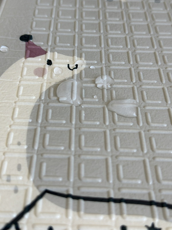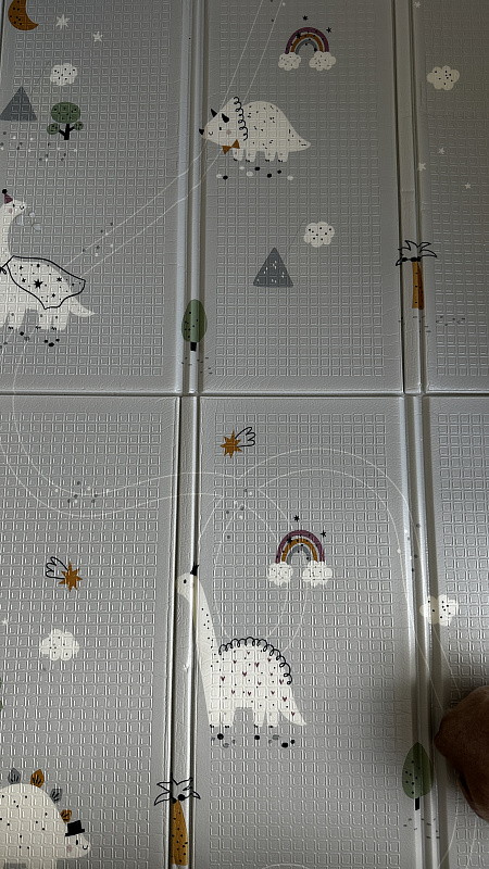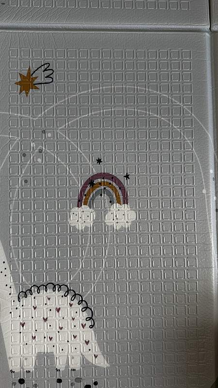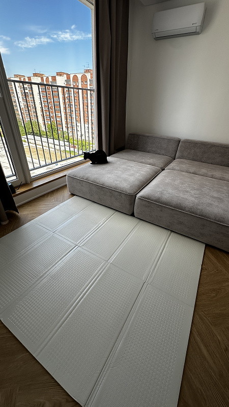Сделан из в меру плотного материала, который не впитывает грязь и воду, легко моется. Коврик хорошо защищает от падений и холодного пола.