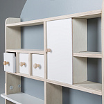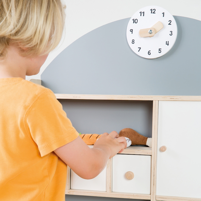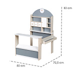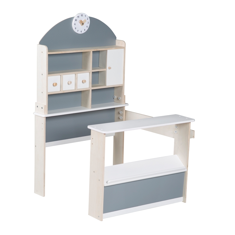 В магазине из натурального дерева с полками, боковым прилавком и передней полкой достаточно места для разнообразного ассортимента товаров. Маленькие торговцы в игровой форме научатся обращаться с типами товаров, количеством и числами, а также читать часы.
