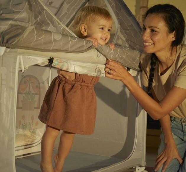 Манеж - кровать Cam Daily Dolci Sogni (Кам дейли дольче согни) - полноценная кроватка для ребенка с рождения до 15 кг с очень легким весом и компактным сложением. Кроватка предусматривает два уровня спального ложа по высоте: для новорожденного - верхний уровень (подвесной), для ребенка от 9 кг - нижний уровень. Основанием для сна служит плотный складной матрасик, который идет в комплекте. Преимуществом данной модели является оригинальный дизайн кровати. Кровать выполнена в виде домика с окошками, гирляндами, дверью. На кровать устанавливается съемная крыша. Для удобного доступа к ребенку предусмотрено большое окошко на капюшоне. В самом манеже предусмотрен большой лаз на молнии, который делает кроватку удобной для игр и самостоятельного использования кровати ребенком.