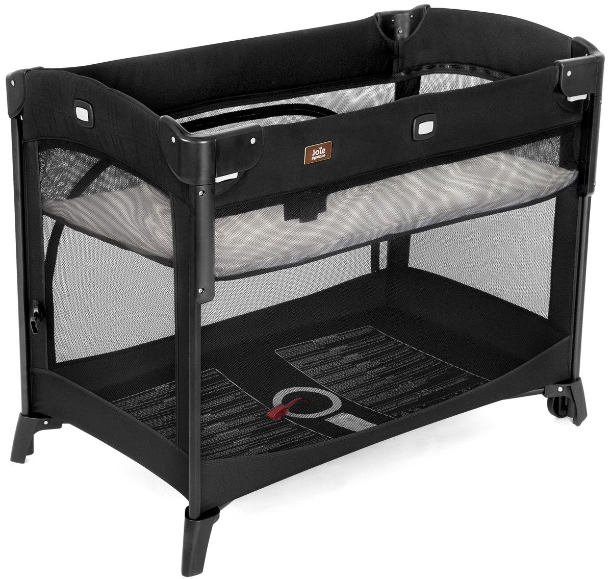 Joie Kubbie Sleep оснащён полноразмерной навесной люлькой для новорождённых и матрасиком для верхнего и нижнего уровней. Также манеж можно использовать как приставную кроватку к большой родительской кровати. Сетчатые секции обеспечивают циркуляцию воздуха и обзор для малыша.