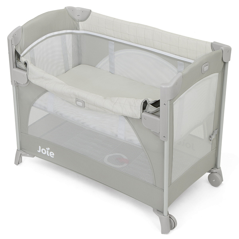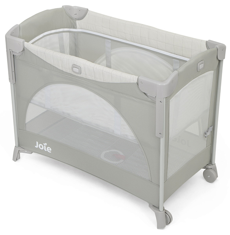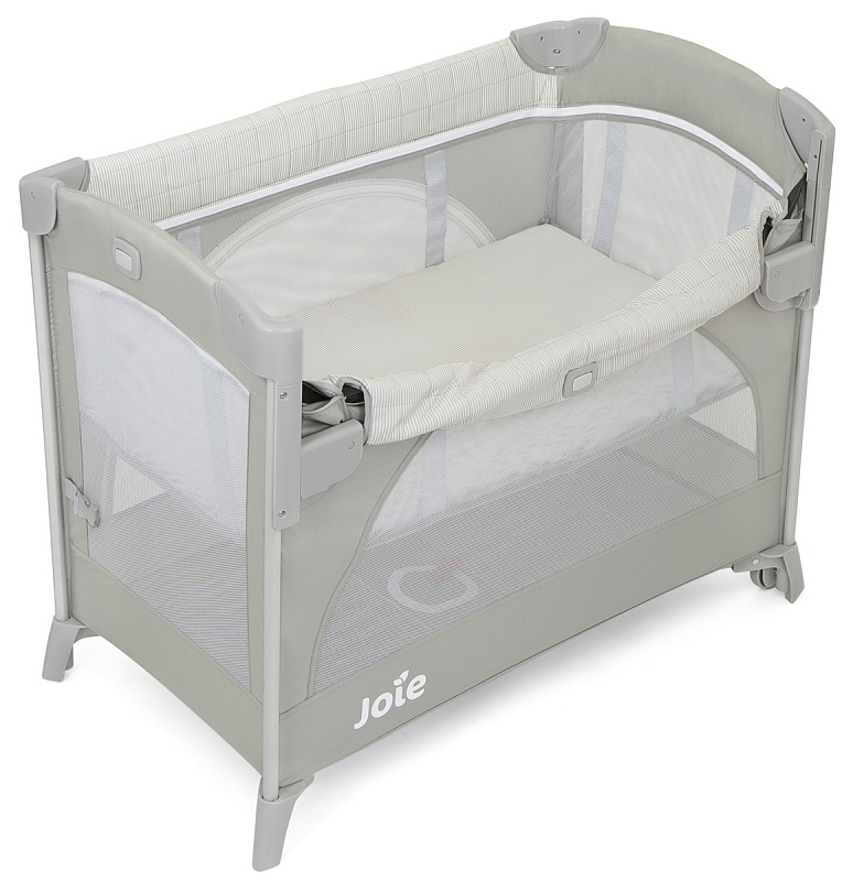Joie Kubbie Sleep оснащён полноразмерной навесной люлькой для новорождённых и матрасиком для верхнего и нижнего уровней. Также манеж можно использовать как приставную кроватку к большой родительской кровати. Сетчатые секции обеспечивают циркуляцию воздуха и обзор для малыша.