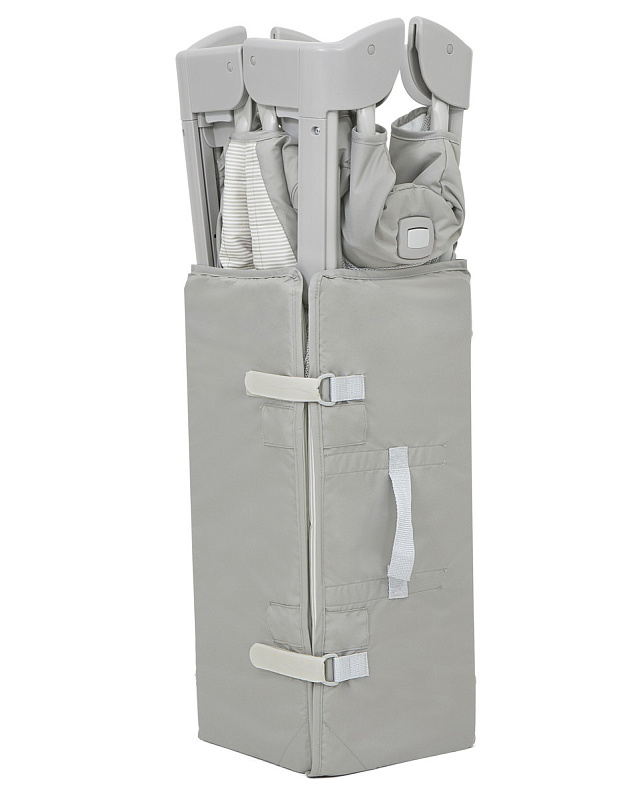 Манеж легко складывается и разбирается, а в сложенном виде занимает мало места (27x25x80,5 см). Он изготовлен из гипоаллергенных материалов и поставляется с сумкой для хранения и переноски.