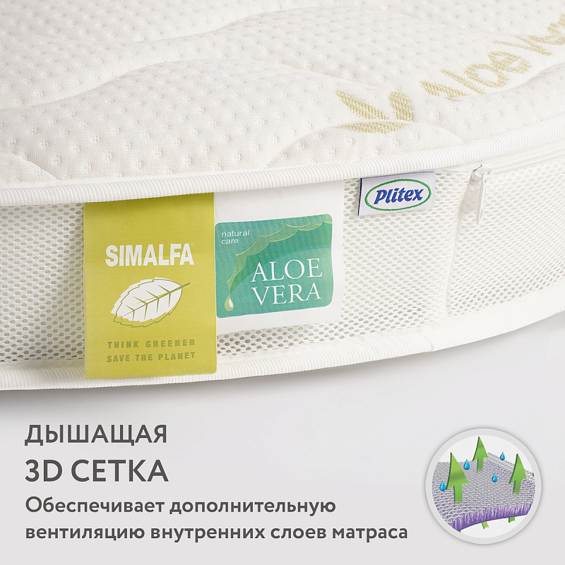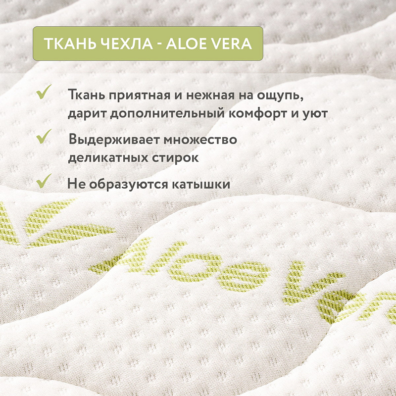 3) AloeVeraFibre (80 мм) — материал нового поколения (производство Verbeq, Германия-Россия). Волокна в этом наполнителе скручены наподобие маленьких пружинок, такая форма повышает упругость материала, делает поверхность более устойчивой к деформации. Кроме того, AloeVeraFibre обладает антибактериальными свойствами алоэ вера, экологичен и безопасен для детей (есть соответствующий сертификат качества).