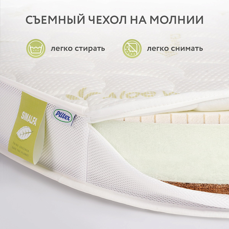 На стороне для новорожденных — натуральные волокна кокосовой койры, скрепленные латексом. На второй стороне — натуральный латекс, который обеспечивает точечное распределение нагрузки тела ребенка.