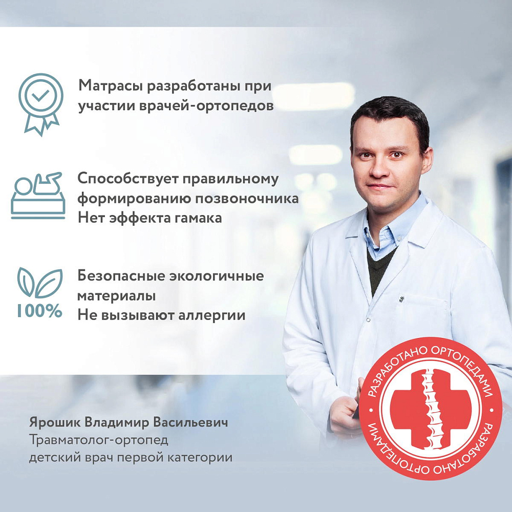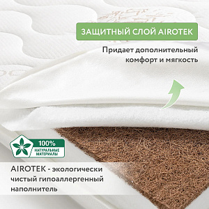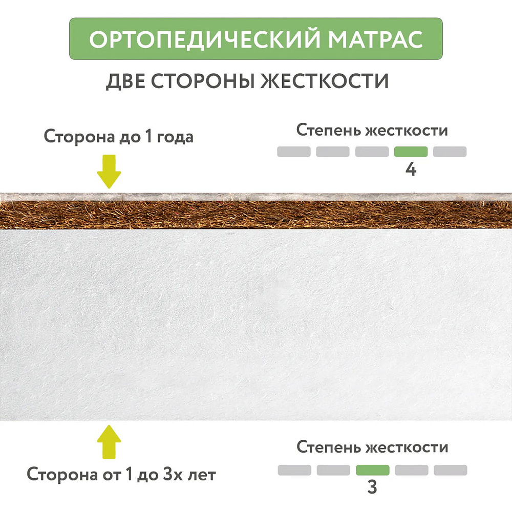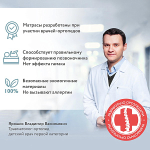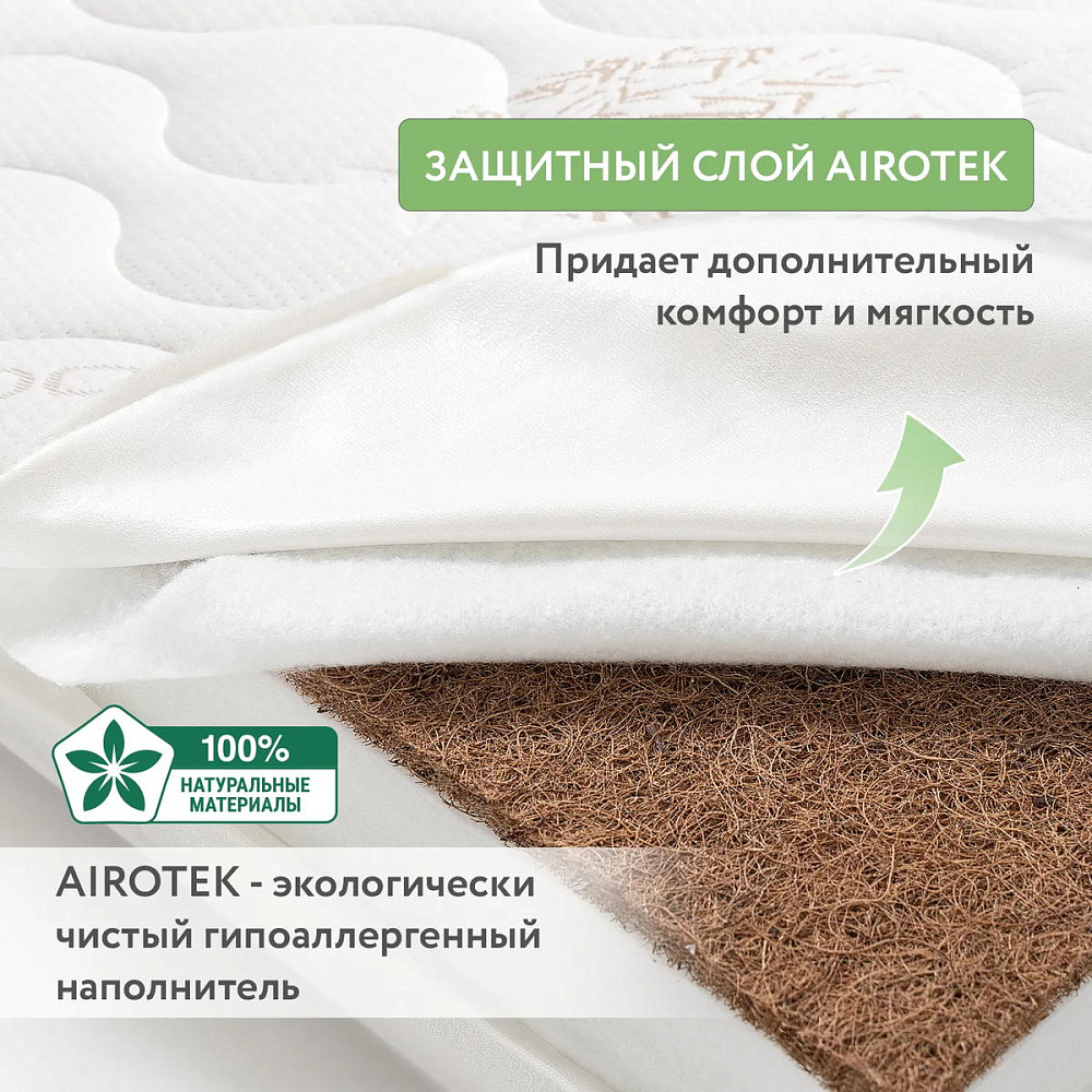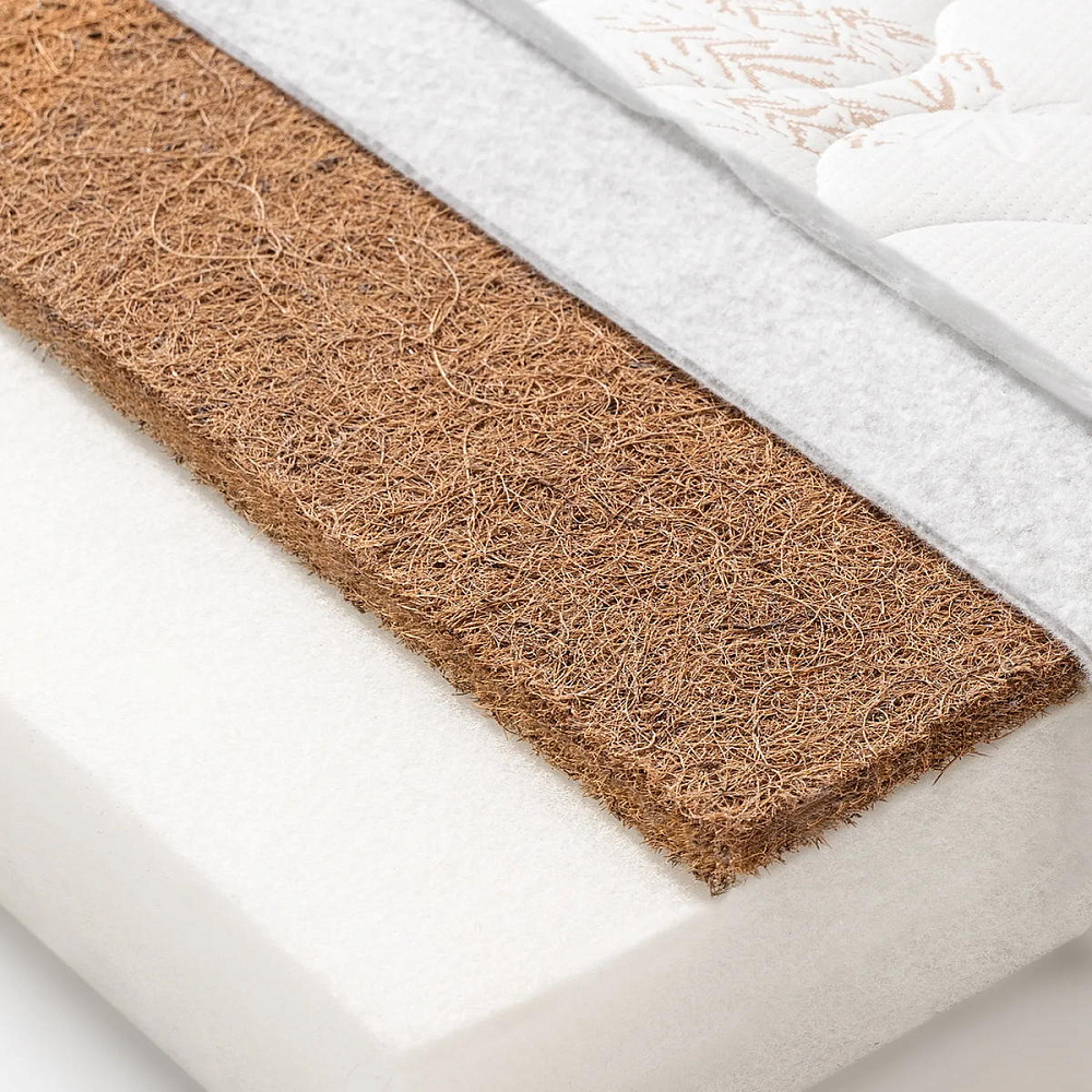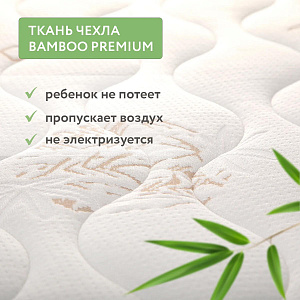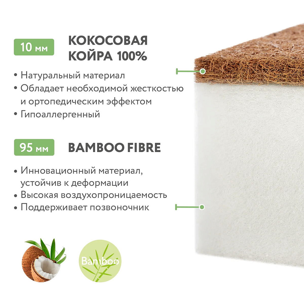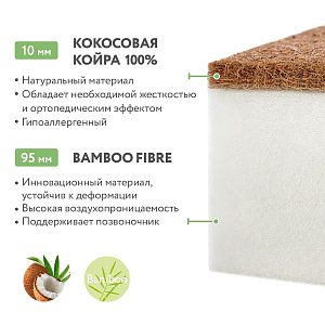 Детский беспружинный матрас на основе сочетания плотных натуральных и инновационных наполнителей. Комбинация кокосовой койры по двум внешним сторонам и экологичного Bamboo Fibre в основе модели создает надежную поддержку позвоночника ребенка.