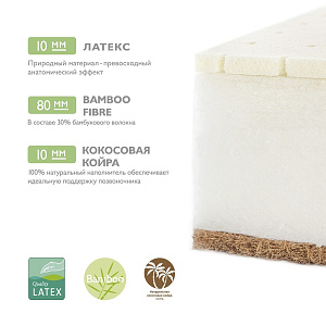 Жесткий и прочный наполнитель из переплетенных волокон кокосового ореха, скрепленных латексом – вспененным соком каучукового дерева. На 100% натуральный материал, экологически чистый и долговечный, один из лучших, которые может предложить нам природа. Обладает исключительными антиаллергическими и антибактериальными свойствами: не впитывает запахи и влагу, не гниет, отлично пропускает воздух и регулирует температуру, к тому же не деформируется. А самое главное – идеально поддерживает позвоночник маленького ребенка во время сна. По мнению ортопедов и педиатров, идеальный наполнитель матрасов для новорожденных.