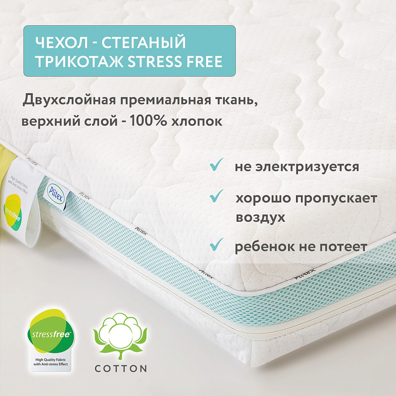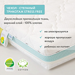 Стеганый чехол нового поколения StressFree тоже обладает особым свойством: он нейтрализует статическое электричество, даже если ребенок ворочается во сне. Верхний слой чехла – 100 % хлопок, на нем спать удобно в любую погоду. А специальная 3D сетка по периметру чехла создает дополнительный доступ воздуха к наполнителям. Кроме того, чехол на молнии по трем сторонам, это очень практично: вы можете снять его для стирки и надеть обратно. А в это время наполнители можно проветрить: они соединены между собой. Важно: слои скреплены специальным экологичным составом Simalfa (производство Швейцария). Состав на водной основе, без запаха, безопасен для ребенка и имеет сертификат качества.