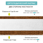 С одной стороны модели слой кокосовой койры 30 мм — эта сторона обладает максимальными ортопедическими свойствами и рекомендуется для новорожденных (жесткость 5 из 5). После этого матрас стоит перевернуть на другую, более эластичную сторону (слой 10 мм. Жесткость 4 из 5).