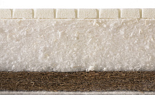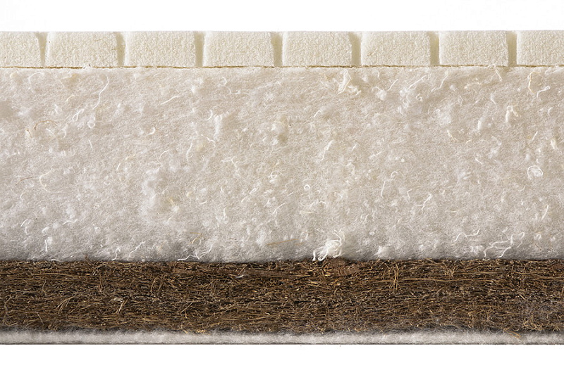 На жесткой стороне мы использовали увеличенный слой натуральной кокосовой койры (30 мм, жесткость 5 из 5), одного из лучших наполнителей для детских матрасов. Упругие натуральные волокна хорошо держат форму, матрас остается как новый весь срок службы, спать на нем ребенку полезно и безопасно.