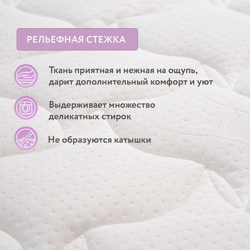 Все детали матраса продуманы так, чтобы вас и вашего малыша ничего не беспокоило. Материал чехла быстро впитывает жидкость и быстро сохнет, а 3D сетка по периметру чехла улучшает вентиляцию наполнителей.