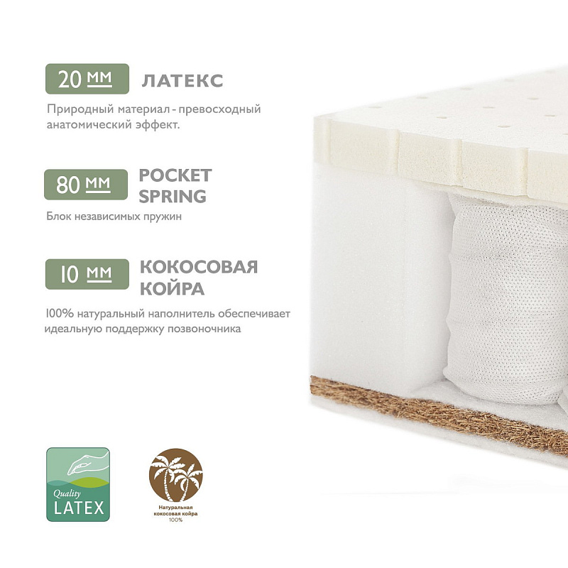 Детский ортопедический матрас премиум-класса с блоком независимых пружин PocketSprings. Модель повышенной комфортности на основе натуральных наполнителей. Матрас обеспечивает двойной эффект: ортопедические свойства и удобство даже для чувствительного ребенка. Двусторонняя модель. На одной стороне (кокосовая койра 10 мм) рекомендуется спать новорожденному, а вторая (латекс 20 мм), подойдет ребенку после года. Матрас прекрасно вентилируется, быстро сохнет и не впитывает запахи. Еще одна важная особенность — стеганый чехол, поверхность которого изготовлена из органического хлопка, выращенного без использования хим. удобрений и собранного вручную. Это эталон экологичности, такой материал подойдет даже детям с аллергией. Чехол съемный, на молнии по трем сторонам. Так вы можете проверить стороны матраса, а также легко снять чехол для стирки и надеть обратно.
