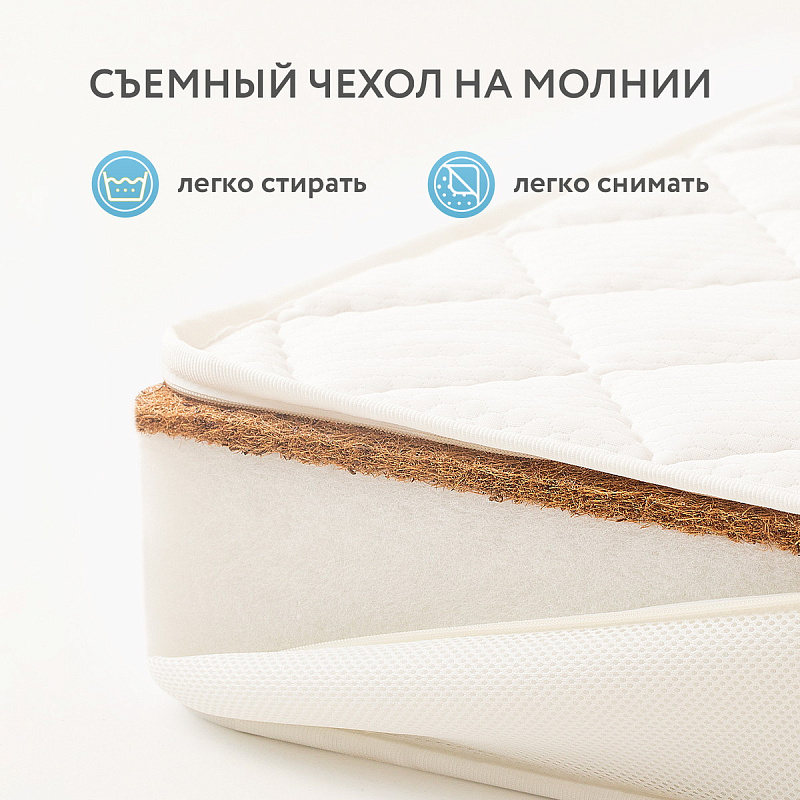 Недорогой ортопедический беспружинный матрас из экологически чистых материалов с разной жесткостью сторон. Основа матраса – плита из гипоаллергенного, прекрасно сохраняющего форму материала - Hollcon Plus. В качестве настилочного материала с одной из сторон – кокосовая койра, придающая матрасу жесткость. Оба наполнителя – холлкон и латексированная кокосовая койра – не впитывают запахи, не вызывают аллергии, отлично вентилируются. Съемный чехол на молнии с 3D-сеткой по периметру выполнен из стеганого трикотажа - приятной и бархатистой на ощупь ткани. Модель рекомендуется детям от 0 до 3 лет.
