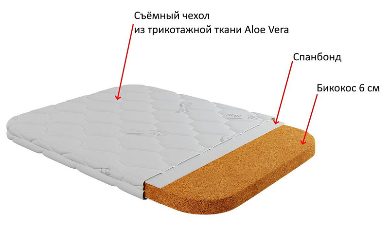 В основе детского матраса Vikalex Сканди расположен слой (6 см) бикокоса и слой спанбонда - тонкого нетканого материала, изготовленного из полипропиленового волокна по технологии термоскрепления.