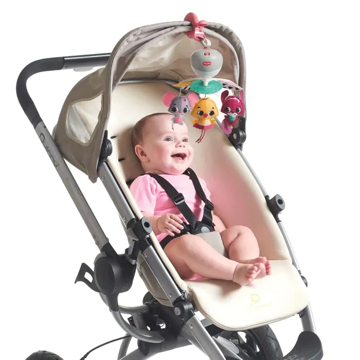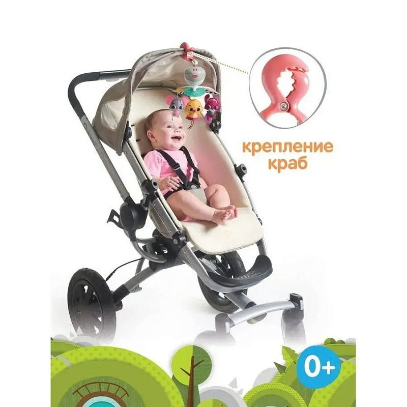 - Разные виды крепления: дуга на кроватку, "краб" и липучка для крепления на коляску и автомобильное кресло;