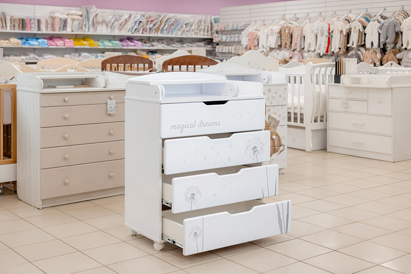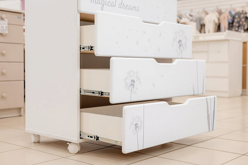 Вместительные ящики устанавливаются на современные и надежные шариковые направляющие, благодаря которым они выдвигаются мягко и бесшумно, что безусловно никак не потревожит Вашего малыша. Также в закрытом положении предусмотрена фиксация ящиков, что предотвращает их самопроизвольное выкатывание.