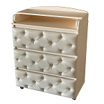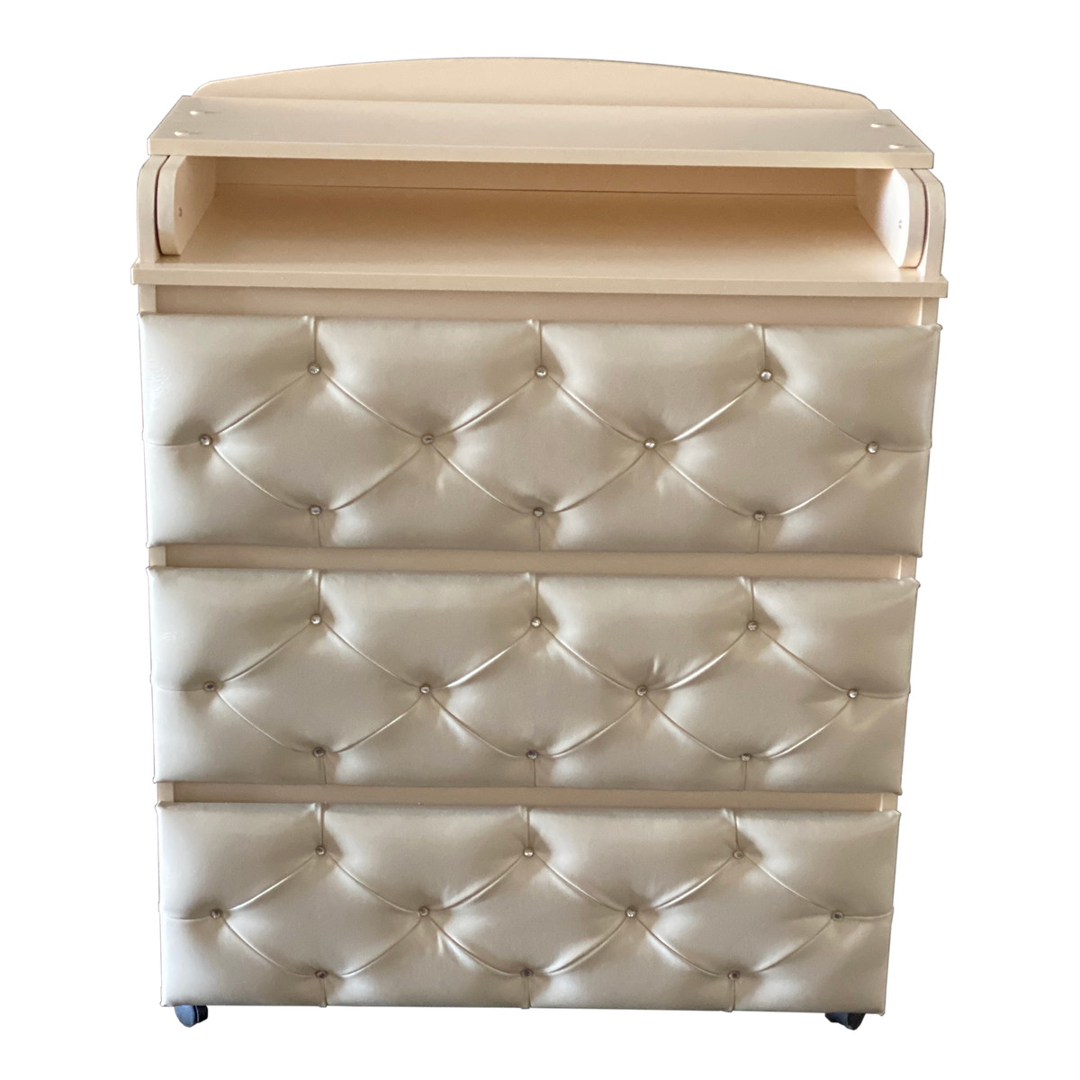 Стильный комод с вместительными ящиками для белья. Фасады выполнены в роскошном классическом стиле. Обивка мягкая, дополнена декоративными пуговицами. Пеленальный столик с откидной крышкой и ограничительными бортиками обеспечит безопасность малышу.