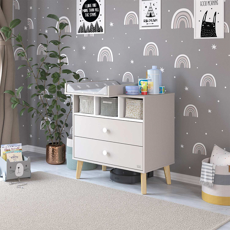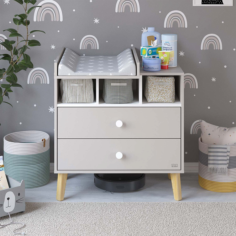 С высотой от пола в 18 см, под комодом легко убираться или разместить робот-пылесос, делая обслуживание детской комнаты более удобным.