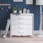 Пеленальный столик можно установить слева, справа или по центру, он легко снимается, не оставляя никаких следов на столешнице, а в сложенном состоянии может использоваться в качестве дополнительной открытой полочки (например, для памперсов и пеленок). Для новорожденного ребенка на комод установлены специальные бортики, полностью исключающие вероятность выпадения малыша во время пеленания или массажа.