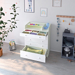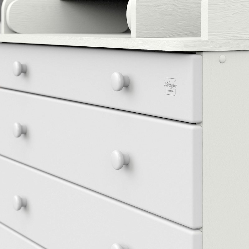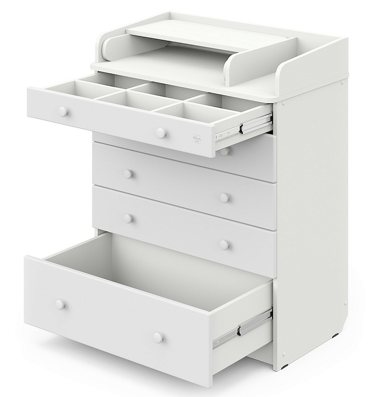 Элегантный, выполненный в современном стиле и удобный пеленальный комод, в комбинациях контрастных оттенков благородной древесины с нежными, приятными на ощупь, белыми или бежевыми фасадами. В комоде используется пеленальный столик с простым и надежным, скрытым механизмом раскладывания. Есть отделение рядом с пеленальным столиком для средств по уходу за малышом в быстром доступе. Комод очень вместительный благодаря пяти ящикам, которые установлены на надежные шариковые направляющие бесшумного хода. Нижний ящик большей глубины, а верхний с органайзером для удобства сортировки детских вещей (6 отделений).