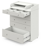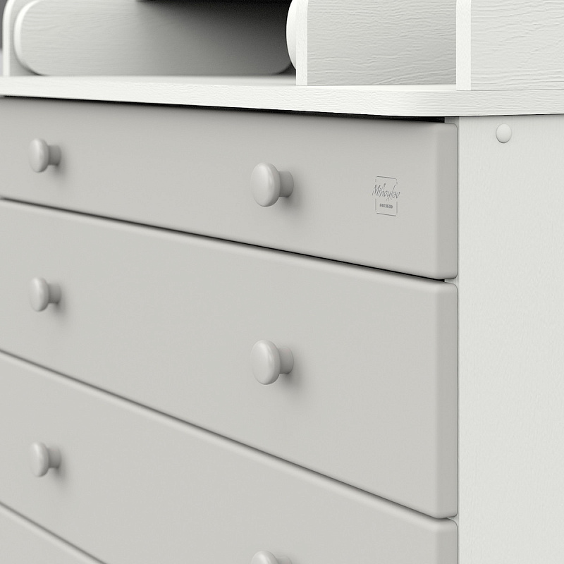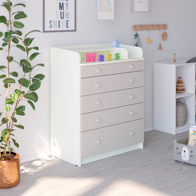 Элегантный, выполненный в современном стиле и удобный пеленальный комод, в комбинациях контрастных оттенков благородной древесины с нежными, приятными на ощупь, белыми или бежевыми фасадами. В комоде используется пеленальный столик с простым и надежным, скрытым механизмом раскладывания. Есть отделение рядом с пеленальным столиком для средств по уходу за малышом в быстром доступе. Комод очень вместительный благодаря пяти ящикам, которые установлены на надежные шариковые направляющие бесшумного хода. Нижний ящик большей глубины, а верхний с органайзером для удобства сортировки детских вещей (6 отделений).