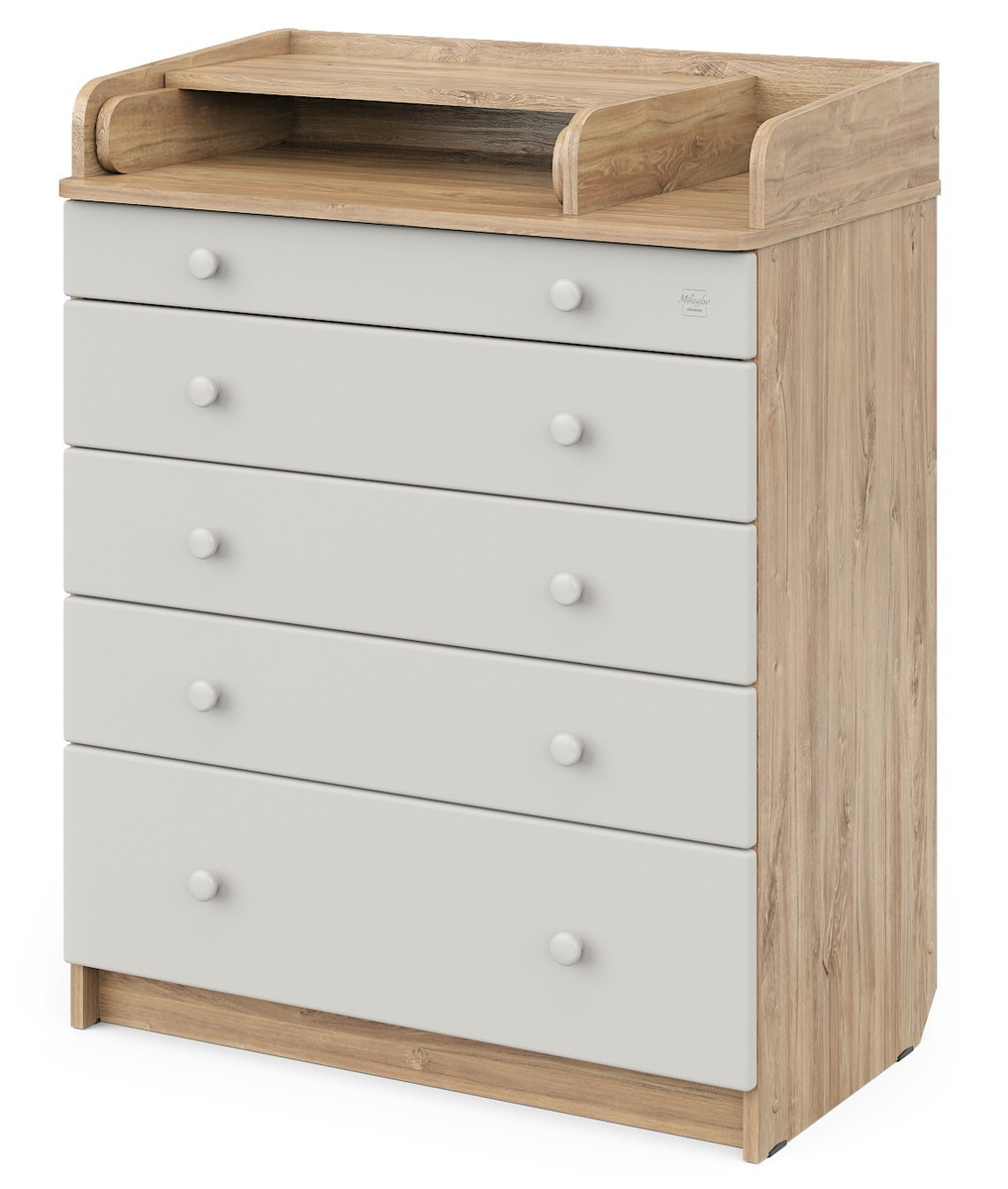 Элегантный, выполненный в современном стиле и удобный пеленальный комод, в комбинациях контрастных оттенков благородной древесины с нежными, приятными на ощупь, белыми или бежевыми фасадами. В комоде используется пеленальный столик с простым и надежным, скрытым механизмом раскладывания. Есть отделение рядом с пеленальным столиком для средств по уходу за малышом в быстром доступе. Комод очень вместительный благодаря пяти ящикам, которые установлены на надежные шариковые направляющие бесшумного хода. Нижний ящик большей глубины, а верхний с органайзером для удобства сортировки детских вещей (6 отделений).