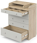 Элегантный, выполненный в современном стиле и удобный пеленальный комод, в комбинациях контрастных оттенков благородной древесины с нежными, приятными на ощупь, белыми или бежевыми фасадами. В комоде используется пеленальный столик с простым и надежным, скрытым механизмом раскладывания. Есть отделение рядом с пеленальным столиком для средств по уходу за малышом в быстром доступе. Комод очень вместительный благодаря пяти ящикам, которые установлены на надежные шариковые направляющие бесшумного хода. Нижний ящик большей глубины, а верхний с органайзером для удобства сортировки детских вещей (6 отделений).