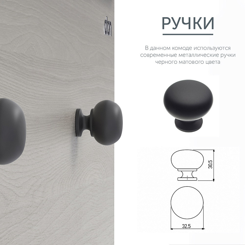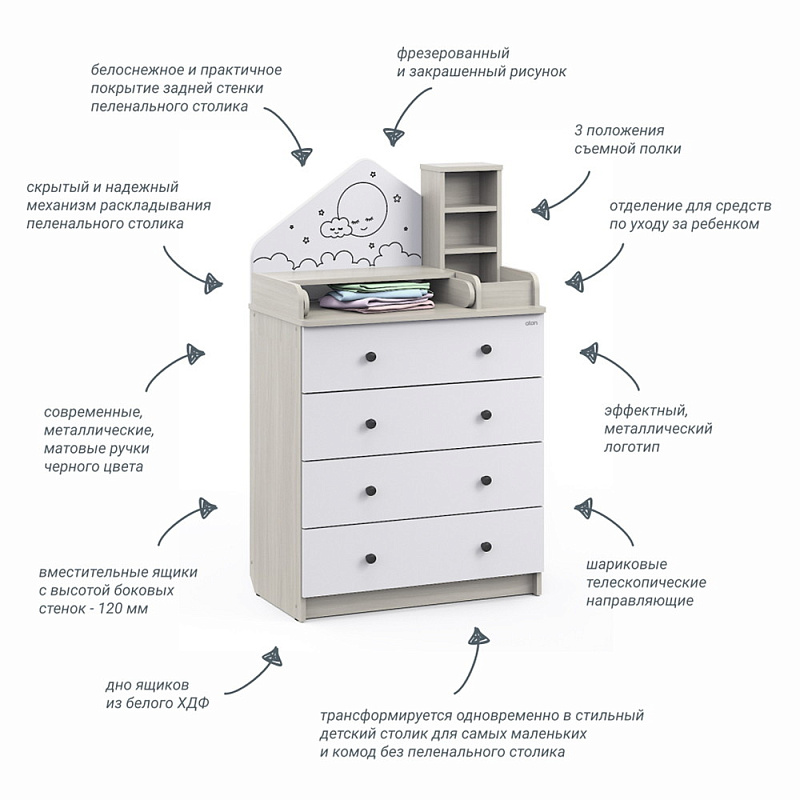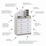 Верхняя полочка имеет три положения по высоте, либо её можно совсем убрать. У столешницы и пеленального столика комода скругленные углы для безопасности. Пеленальный столик оборудован скрытым и надежным механизмом раскладывания. Декоративная вставка выполнена из МДФ.