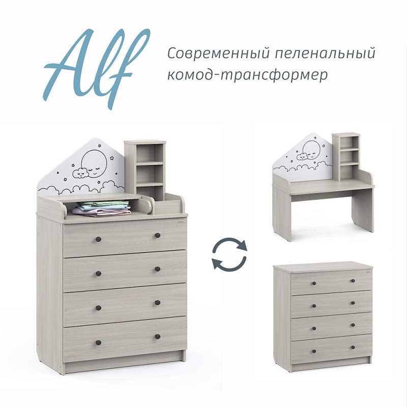 Пеленальный комод АЛЬФ - это симпатичный "домик", который при взрослении ребенка трансформируется одновременно в удобный столик для самых маленьких, а также в обычной комод без ненужного раскладного пеленального столика.