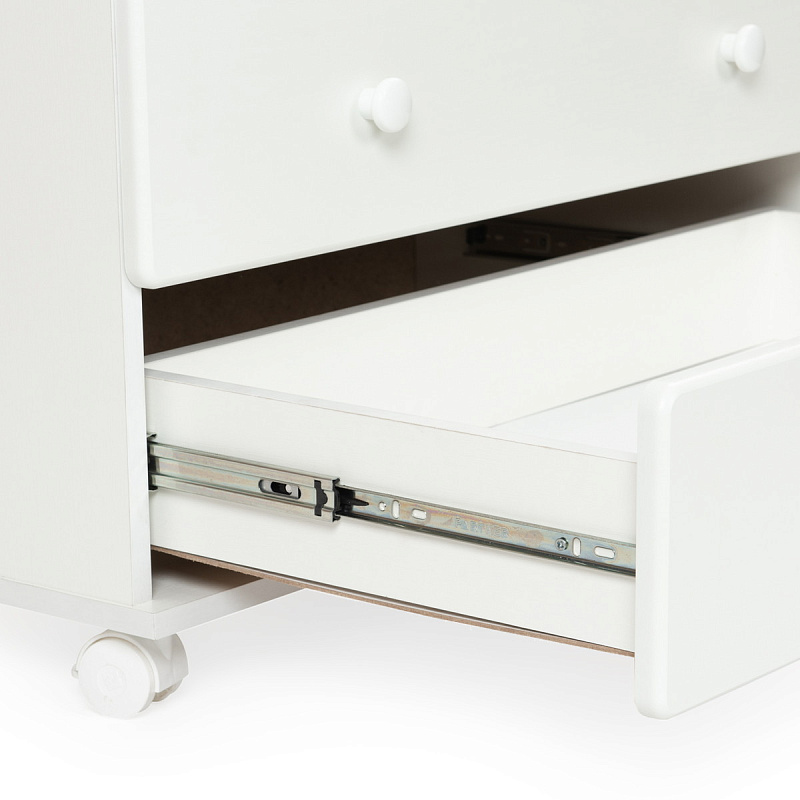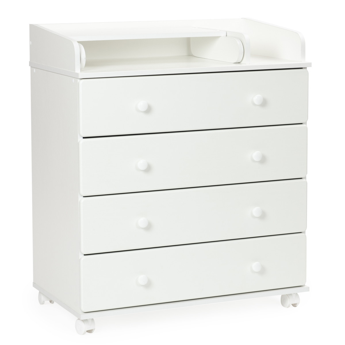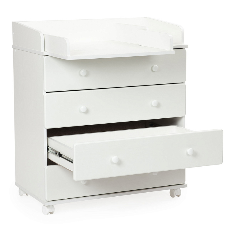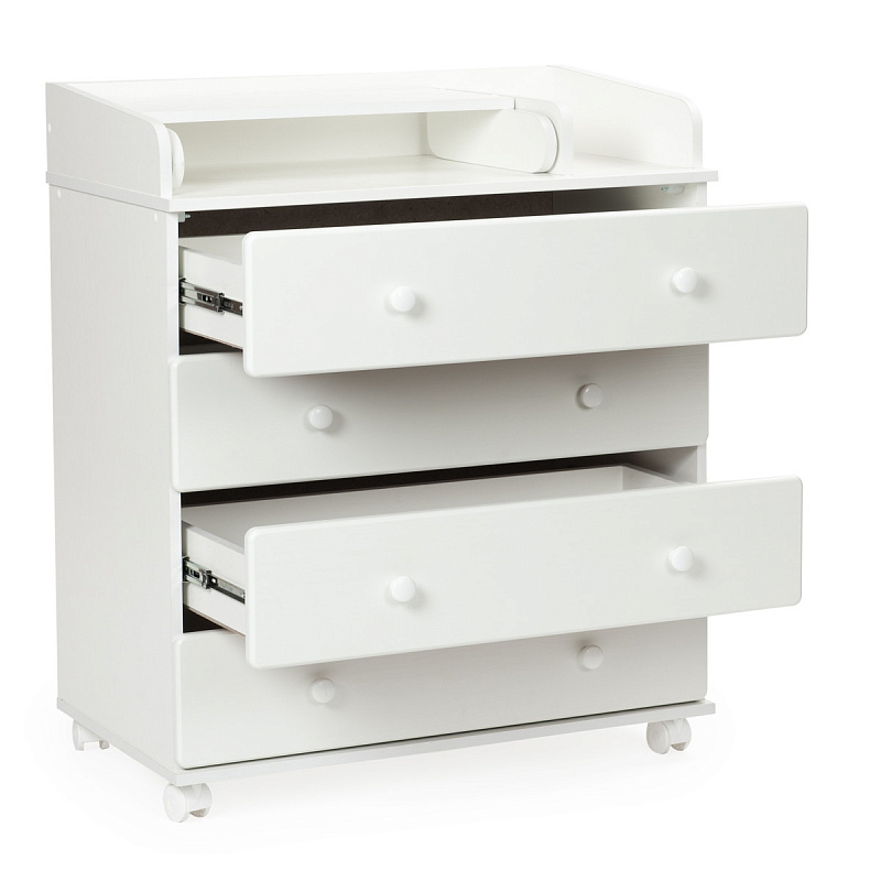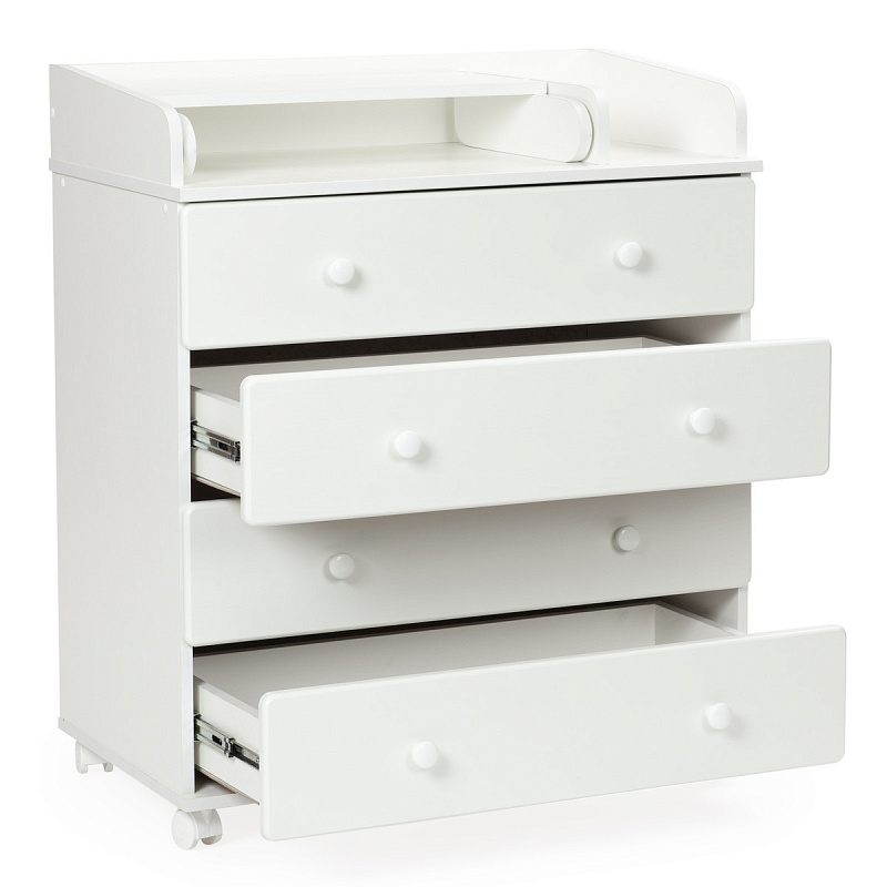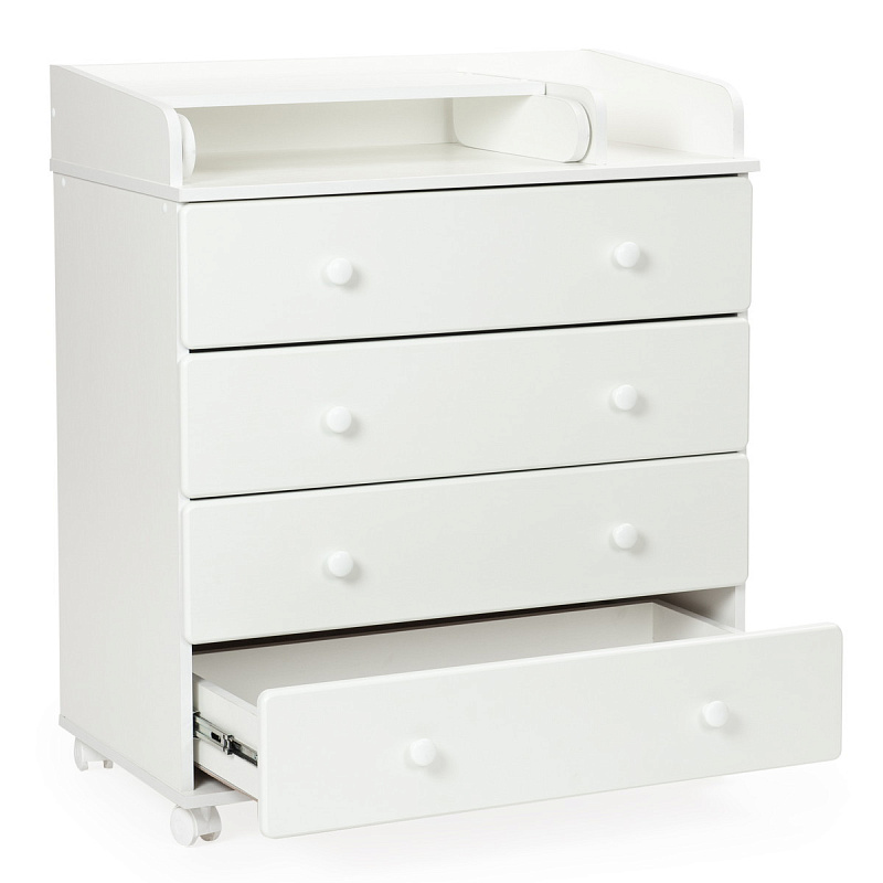 Удобный и практичный комод с 4-я ящиками позволит значительно сэкономить пространство и разместить все необходимое для вашего ребёнка, детские вещи, подгузники, средство для гигиены. Комод оборудован пеленальным столиком с простым и надежным механизмом раскладывания, 4-е вместительных ящика и 4-е колёса со стопором.