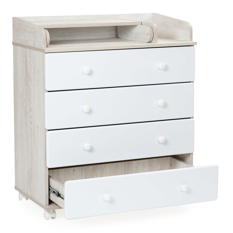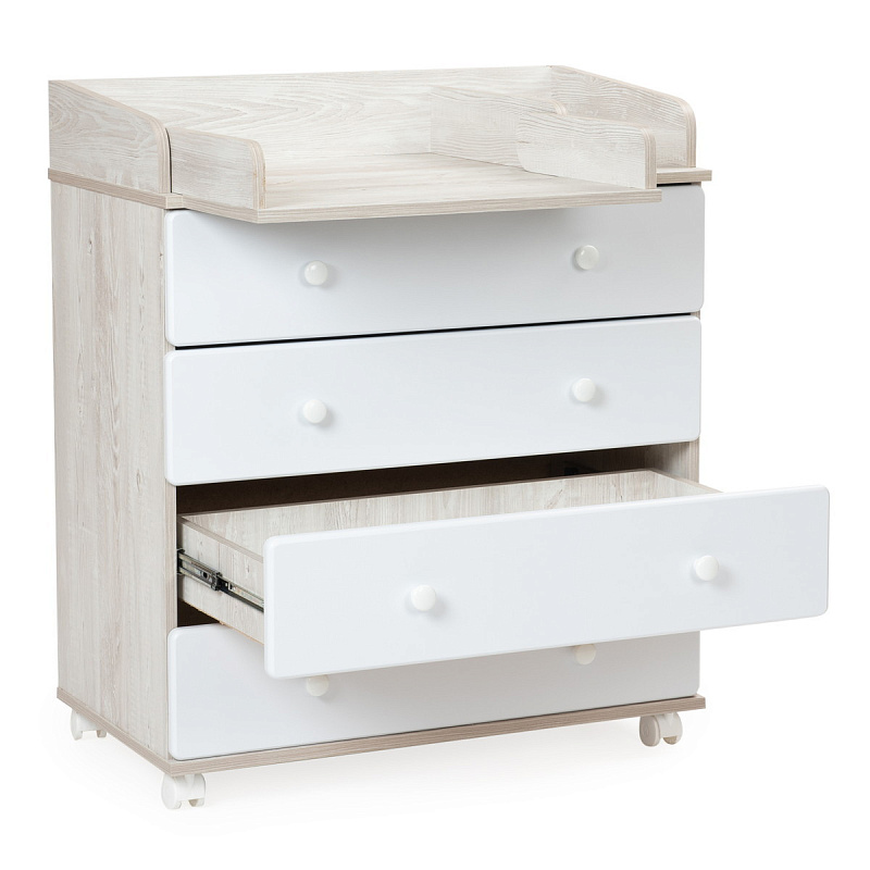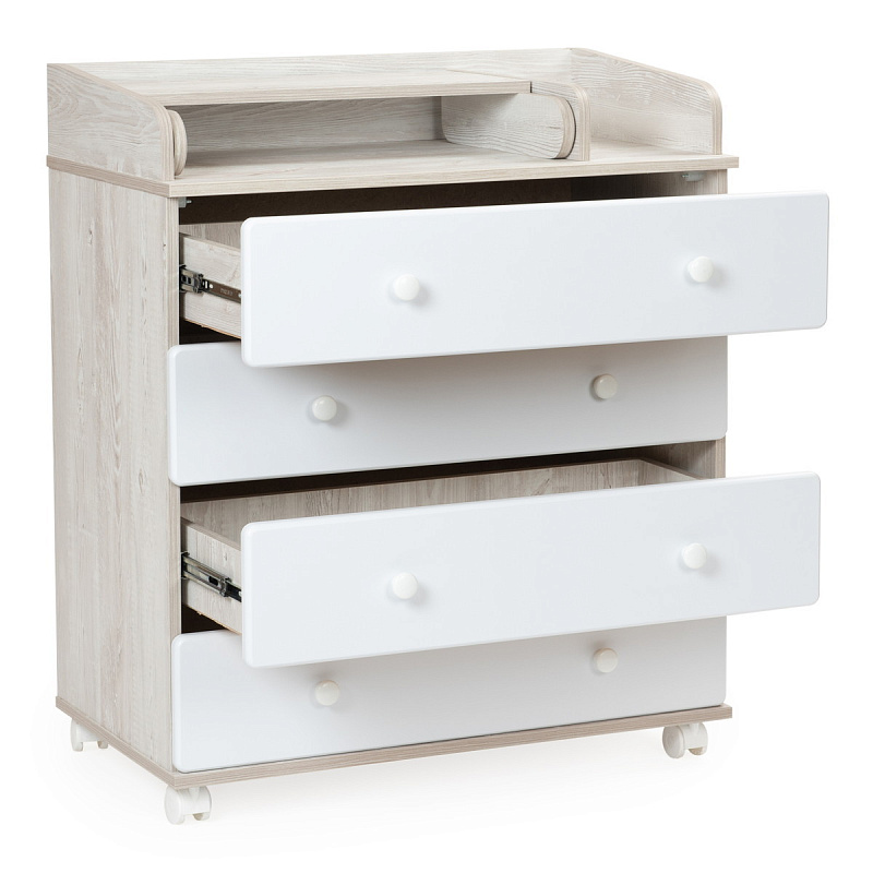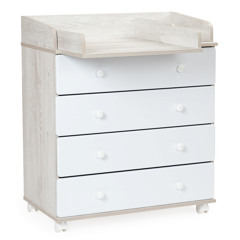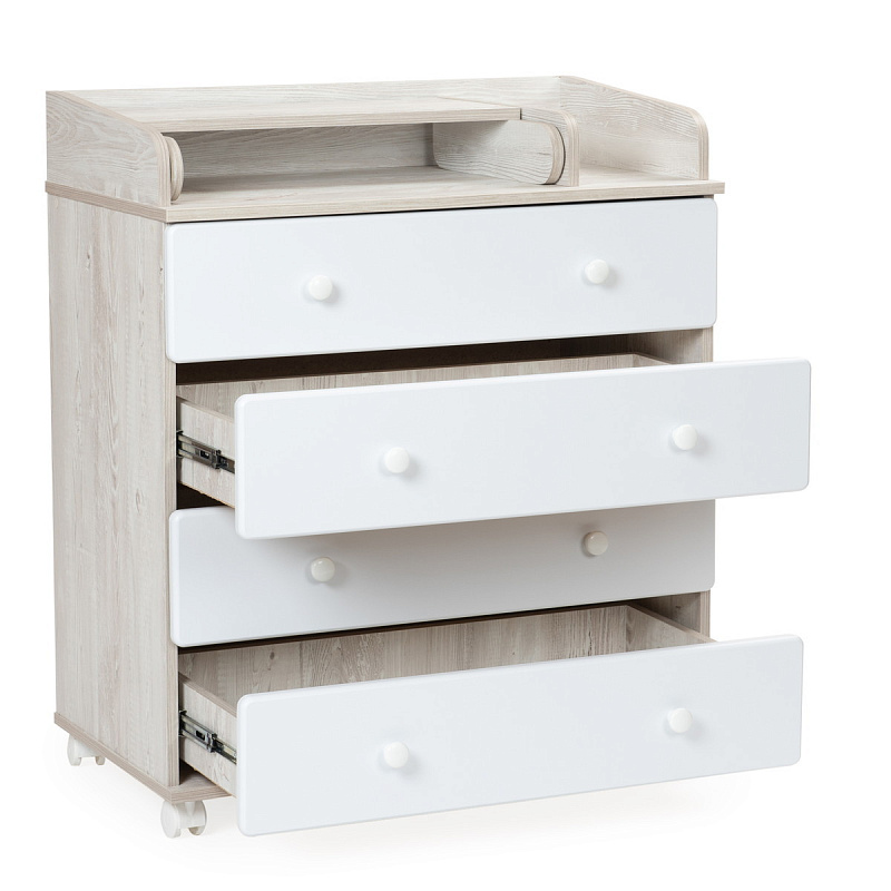 Удобный и практичный комод с 4-я ящиками позволит значительно сэкономить пространство и разместить все необходимое для вашего ребёнка, детские вещи, подгузники, средство для гигиены. Комод оборудован пеленальным столиком с простым и надежным механизмом раскладывания, 4-е вместительных ящика и 4-е колёса со стопором.