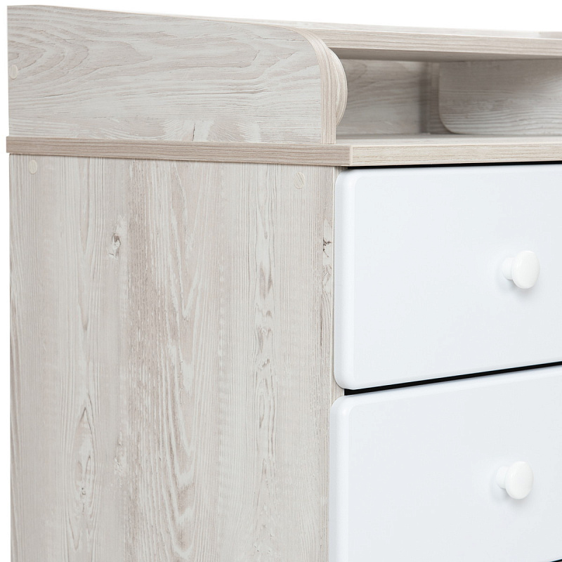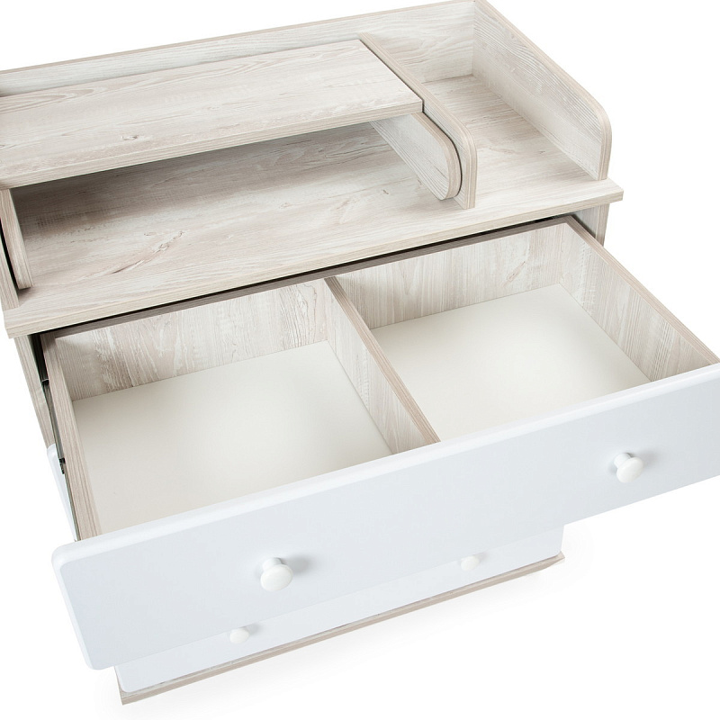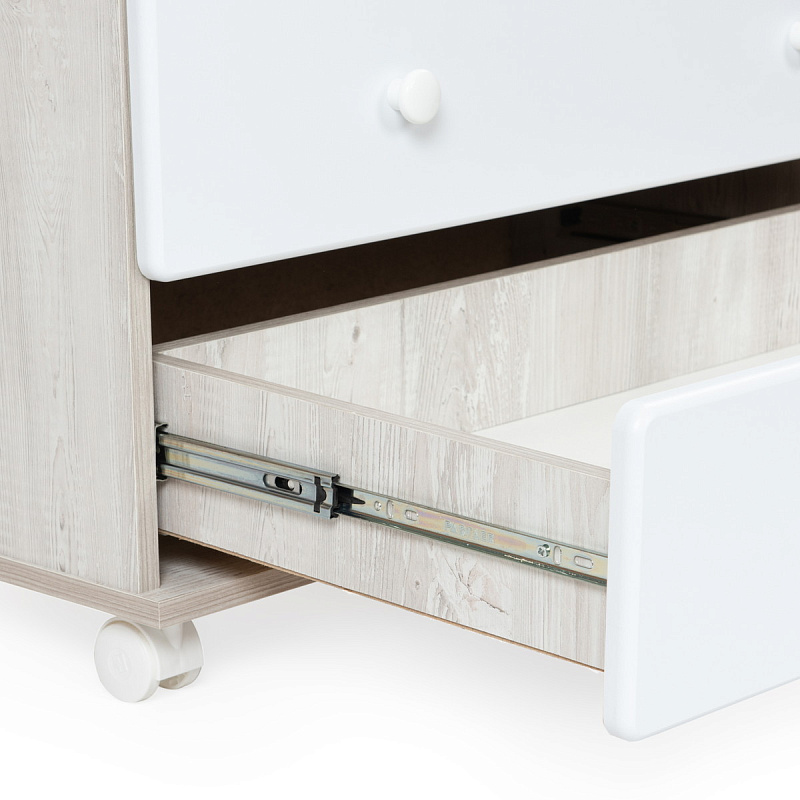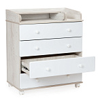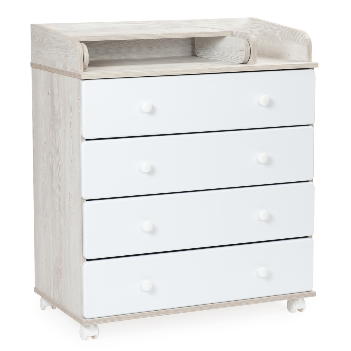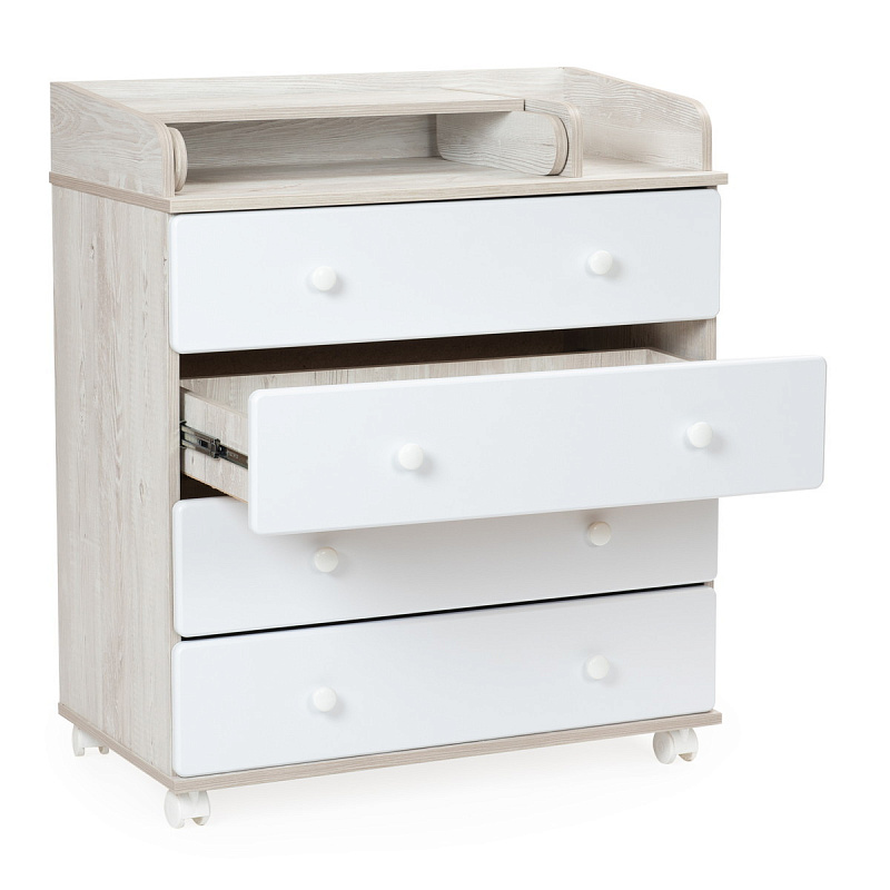 Удобный и практичный комод с 4-я ящиками позволит значительно сэкономить пространство и разместить все необходимое для вашего ребёнка, детские вещи, подгузники, средство для гигиены. Комод оборудован пеленальным столиком с простым и надежным механизмом раскладывания, 4-е вместительных ящика и 4-е колёса со стопором.