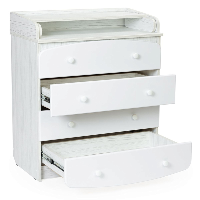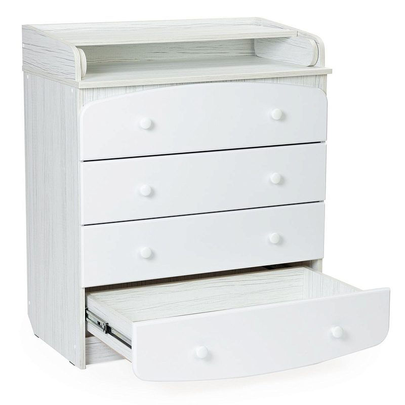 Комод оборудован пеленальным столиком с простым и надежным механизмом раскладывания, 4-е вместительных ящика.
