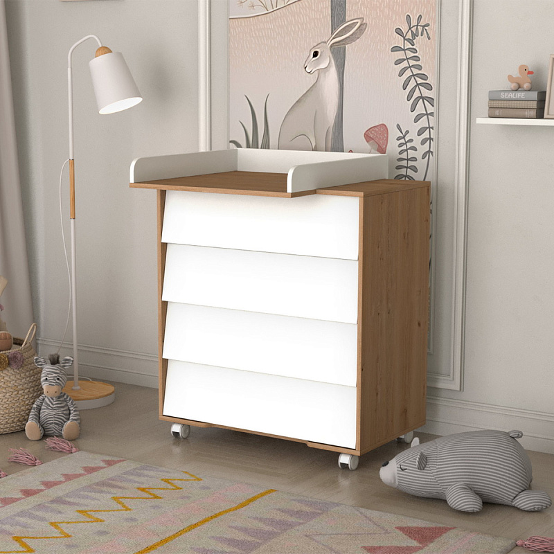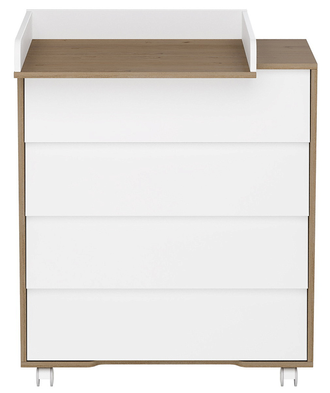 Четыре вместительных ящика с интегрированными ручками можно использовать для хранения детской одежды и гигиенических принадлежностей. Пеленальный столик раскладывается над верхней крышкой, а в сложенном состоянии может использоваться в качестве дополнительной открытой полочки (например, для памперсов и пеленок), боковые бортики, полностью исключают вероятность выпадения малыша во время пеленания или массажа. Также модель CAMBRIDGE оснащена колесиками для быстрого и комфортного перемещения.