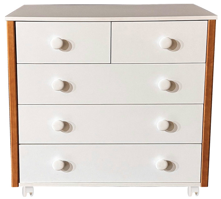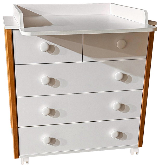 Созданный для нежных объятий и трепетной заботы с самого рождения, этот комод станет верным помощником в уходе за вашим малышом. Плавное скольжение ящиков, оснащенных шариковыми телескопическими направляющими, позволит бесшумно достать все необходимое, не тревожа чуткий сон крохи. Съемная пеленальная столешница превращает комод в удобное место для переодевания и гигиенических процедур, а когда малыш подрастет, легко демонтируется, превращая его в стильный элемент детской комнаты. Пять вместительных ящиков надежно сохранят все детские вещи, от пеленок до любимых игрушек. Корпус и фасад из ЛДСП гарантируют долговечность и простоту в уходе, а изящные вставки из массива дерева, покрытые лаком, добавляют тепла и уюта. Легкое перемещение комода обеспечивают колесики, позволяя с легкостью менять обстановку в комнате. "Кедр Valencia" – это не просто мебель, это островок любви и комфорта для вашего ребенка.