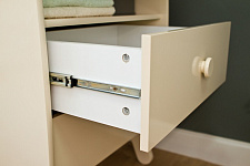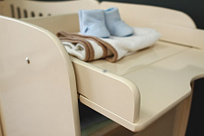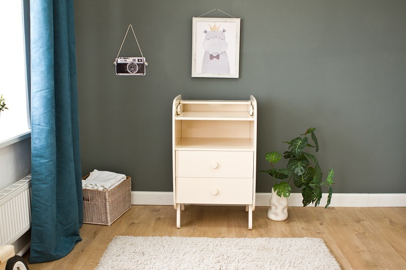 Комод на высоких ножках, с 2-мя углубленными ящиками. Комод оснащен съемной откидной полкой для увеличения поверхности пеленания, комплектуется мягким настилом для пеленания.