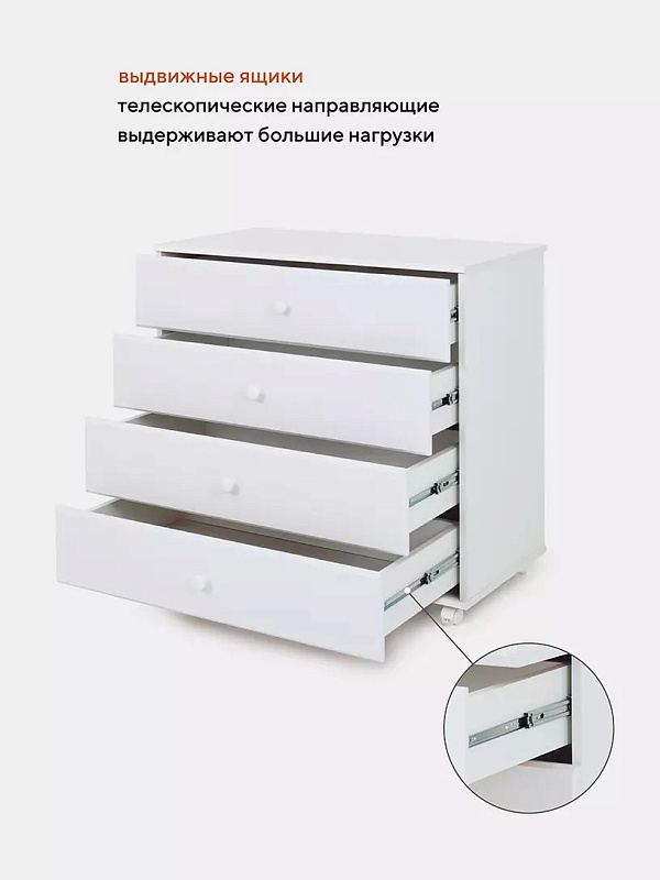 - к тому же ящики дополнены телескопическими направляющими, благодаря которым комод способен выдерживать большие нагрузки на протяжении длительного времени