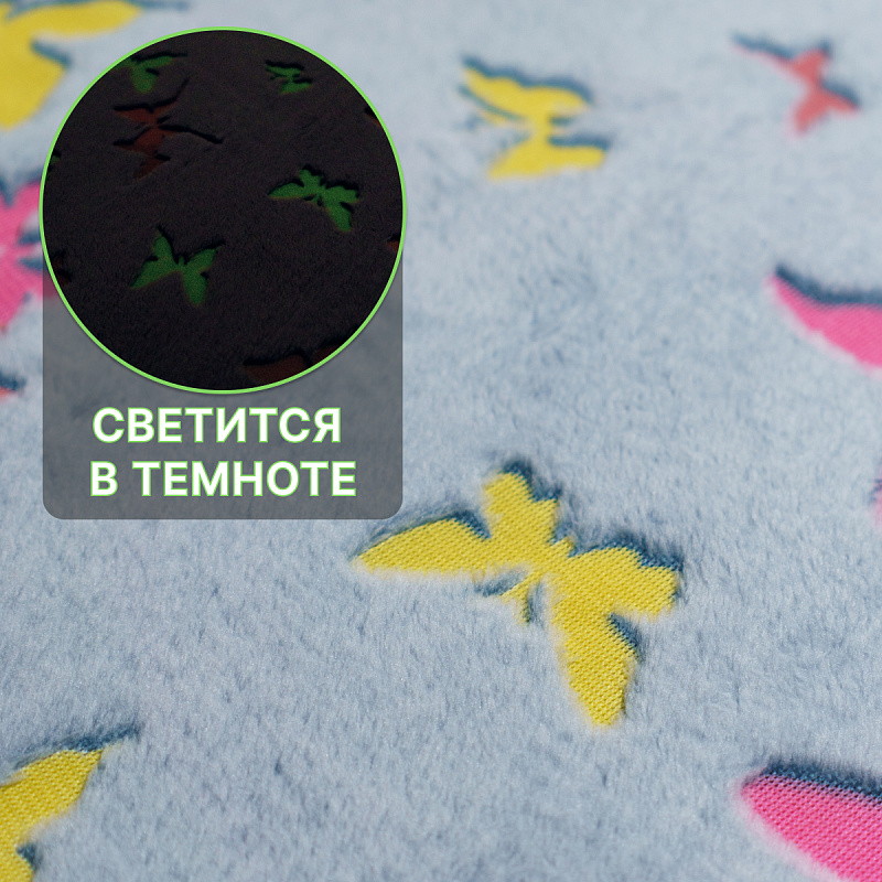 Нежный и мягкий плед с достаточно плотной и очень приятной фактурой, который светится при ярком освещении. Отключите свет и наслаждайтесь магией - плед светится в темноте! Безопасный для здоровья, светящийся компонент содержит органический люминофор, устойчивый к воде и различным излучениям. Плед не только предоставляет комфорт, но также освежает интерьер. Для долговечности и возможности многократной перезарядки перед использованием рекомендуется постирать плед с антистатиком на деликатном режиме.