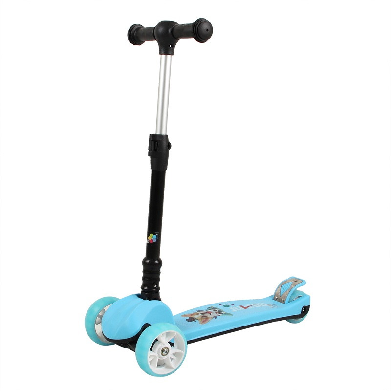 Трёхколёсный самокат с телескопическим рулём имеет складную конструкцию для удобства хранения и транспортировки. Модель с ножным тормозом на заднем колесе.