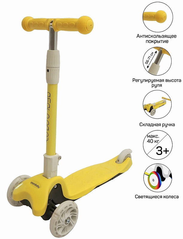 - Мягкие, малошумные полиуретановые колеса. Все колеса самоката светятся разноцветными огнями при движении. Колеса самоката не требуют батареек.