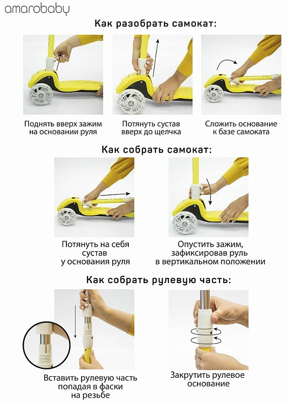 - Самокат легок в сборке-разборке, прост в управлении, маневренный и прочный.